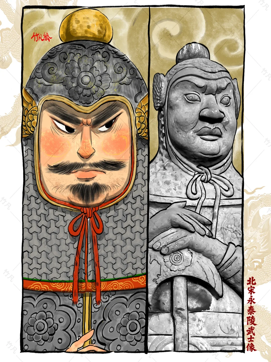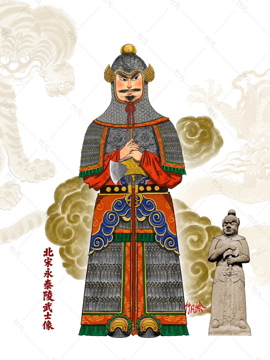 永泰陵为宋哲宗赵煦(1085-1100年在位)的陵寝。 造型风格:武士像全副盔甲,手按长钺,面部表情威严,五官刻画鲜明,体现了宋代写实手法的高超技艺。 我从众多石像中挑选了一尊比较到有代表性的宋甲样式进行手绘复原,石像细节精美绝伦,对绘制起了很大帮助,颜色没有使用金甲样式采用了银色铁甲制式,整体颜色不是很严谨,作为个人喜好进行了调整。