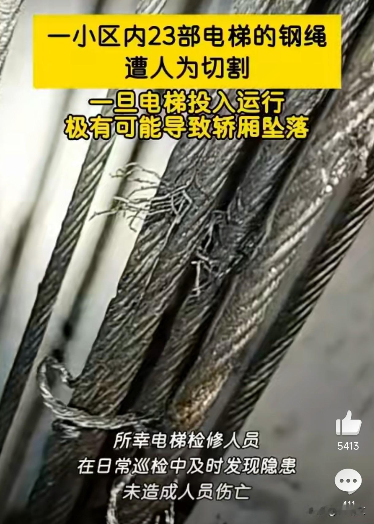呼和浩特这小区险出人命!23部电梯钢绳被割,凶手刚被抓 呼和浩特那疙瘩出事了!祥瑞家园小区50部电梯,愣是有23部的钢绳让人给切了,切口齐刷刷的,这哪是恶作剧,分明是玩命! 幸亏检修的师傅眼尖,日常巡检时瞅见钢绳不对劲。那痕迹太明显了,绝对是人为的,赶紧逐个排查,一数23部都遭了殃,当场就给停机锁了。 你知道这钢绳多关键不?那是电梯的生命线,拽着轿厢和配重,安全系数得够12倍才能用。现在被割得快断了,一运行指定坠梯,后果想都不敢想。 警方刚把人抓了,一男一女,37岁,叫毛某某和高某某,已经刑拘了。但大家伙儿更犯嘀咕:这俩人到底图啥?跟谁结仇要拿全小区人命撒气? 这可不是小打小闹的破坏。之前上海有个醉汉砸电梯面板,就因为涉嫌危害公共安全被刑拘了。这次直接割钢绳,比那严重十倍,判刑指定轻不了。 有人说是不是维保不到位?真冤枉人家了。现在电梯钢绳自带润滑剂,乱加油反而加速磨损,师傅们每月都巡检,这次全靠他们救了场。 昆明之前就出过事,电梯维保造假,钢丝绳有问题没发现,直接冲顶把人砸死了。你看,维保要是糊弄事,再遇上这破坏,简直是双重催命符。 这事儿里藏着俩大问题。一是小区安防太松,割23部电梯钢绳得花不少时间,咋就没人发现?二是人心叵测,对公共设施下手,根本没把别人的命当回事。 咱普通住户也得懂点门道。平时乘电梯多留意,听见异响、感觉晃动就赶紧报修。电梯里都贴维保记录,定期查查,别等出事才后悔。 物业更得支棱起来。监控得24小时盯着,尤其是电梯机房这种关键地方。外来人员登记、夜间巡逻都不能少,别让坏人有可乘之机。 破坏公共设施真不是小事。轻则赔维修费,重则负刑责。就像西安那醉汉踹坏电梯,不光被困,最后还赔了9000块,纯属自找罪受。 这事儿也算给全国敲了警钟。电梯安全从来不是小事,维保是底线,安防是防线,缺一个都可能出人命,谁也不能掉以轻心。 现在受损电梯正抢修,陆续能恢复运行了。但想想还是后怕,要是师傅晚发现一天,得有多少家庭被毁掉? 你家小区电梯维保到位不?安防做得咋样?有没有遇见过可疑人员?评论区说说,咱也互相提个醒,毕竟安全这事儿,得靠大家伙儿一起盯着。