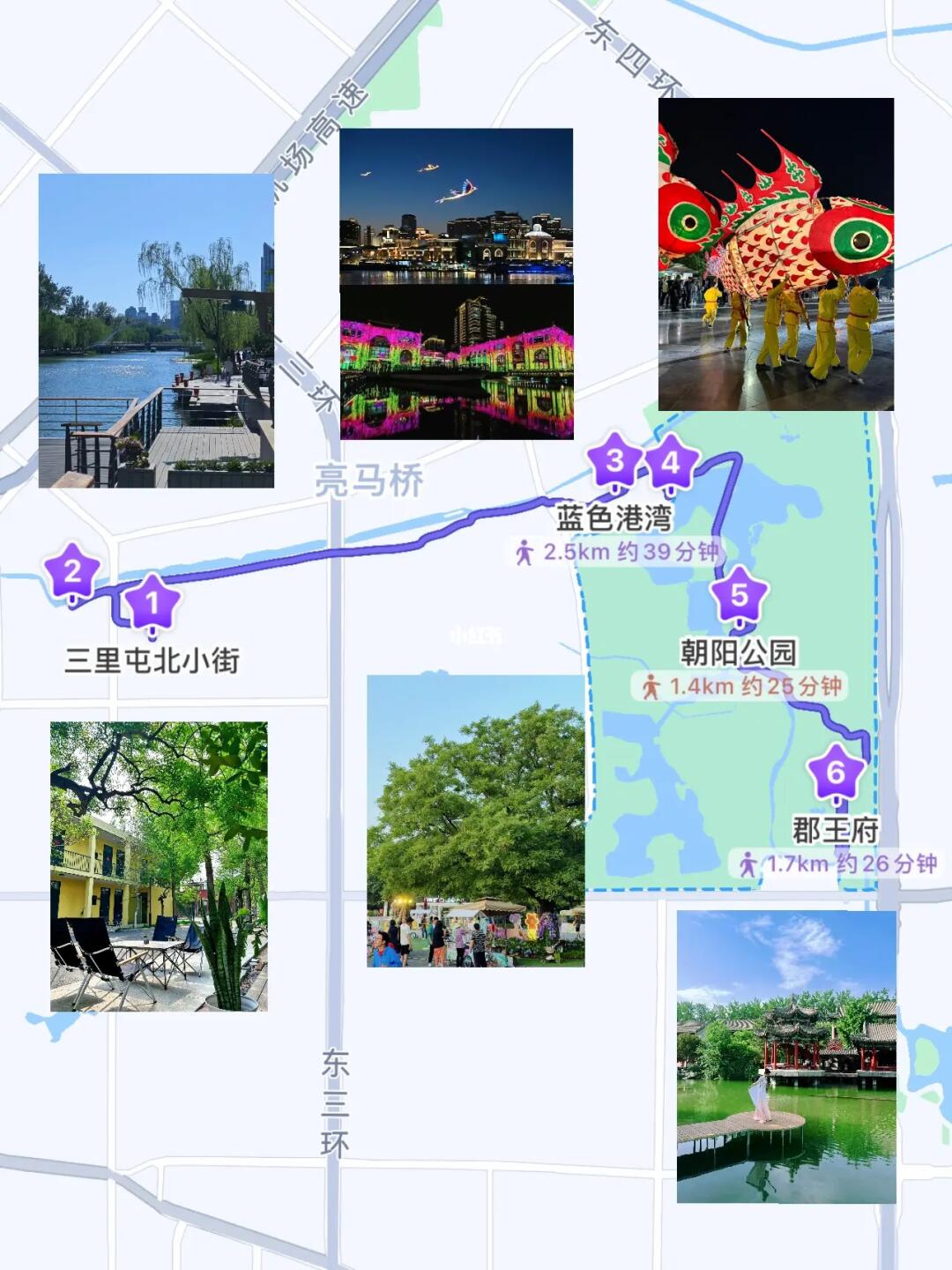 三里屯北小街🍴-亮马河南路-亮马河畔🚤-蓝港观鱼🐟-蓝色港湾-朝阳公园-落日飞车🎡-郡王府