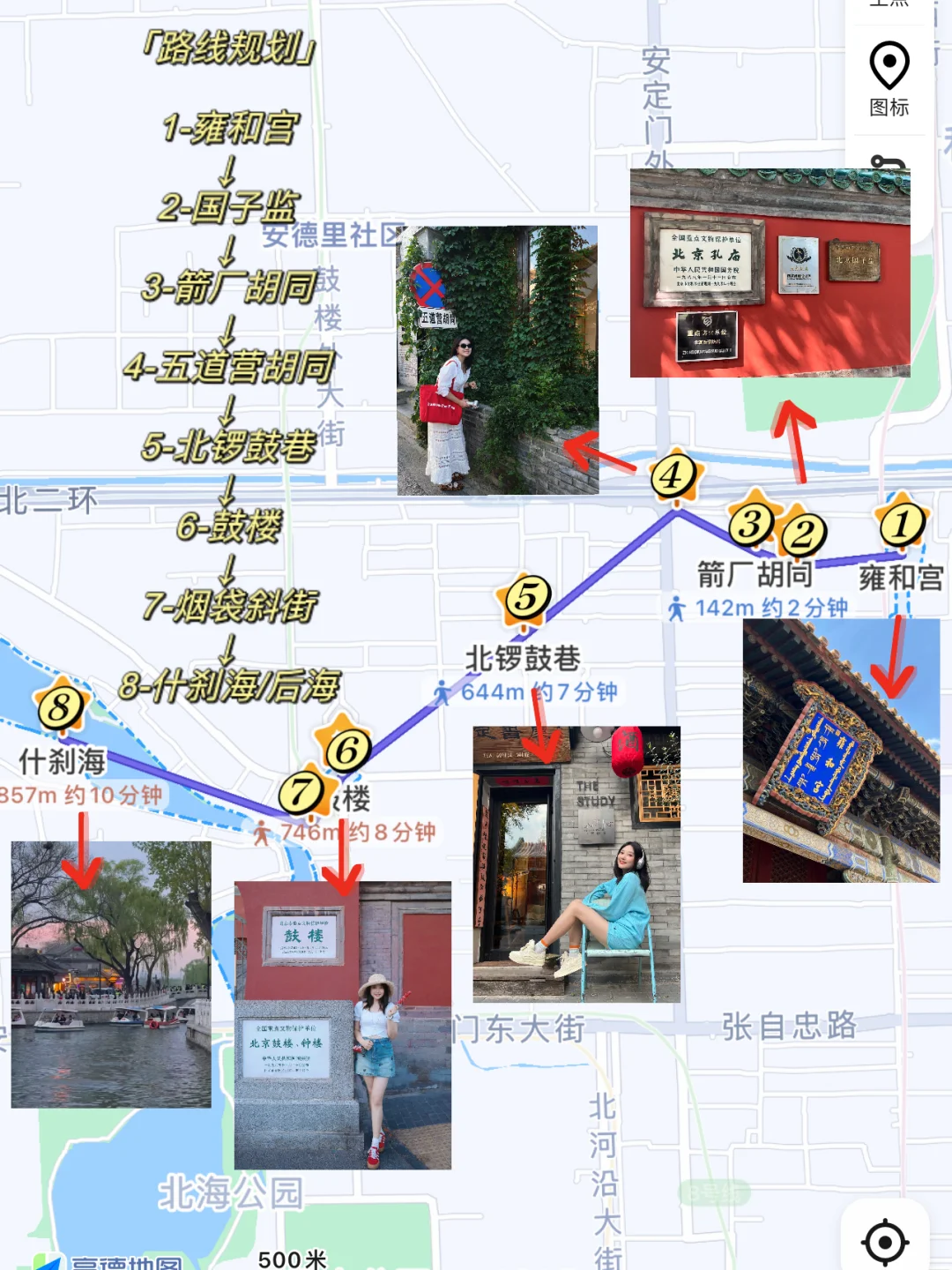 雍和宫📿➔国子监街📚➔箭厂胡同➔五道营胡同➔北锣鼓巷➔鼓楼➔烟袋斜街➔后海/什刹海🌄