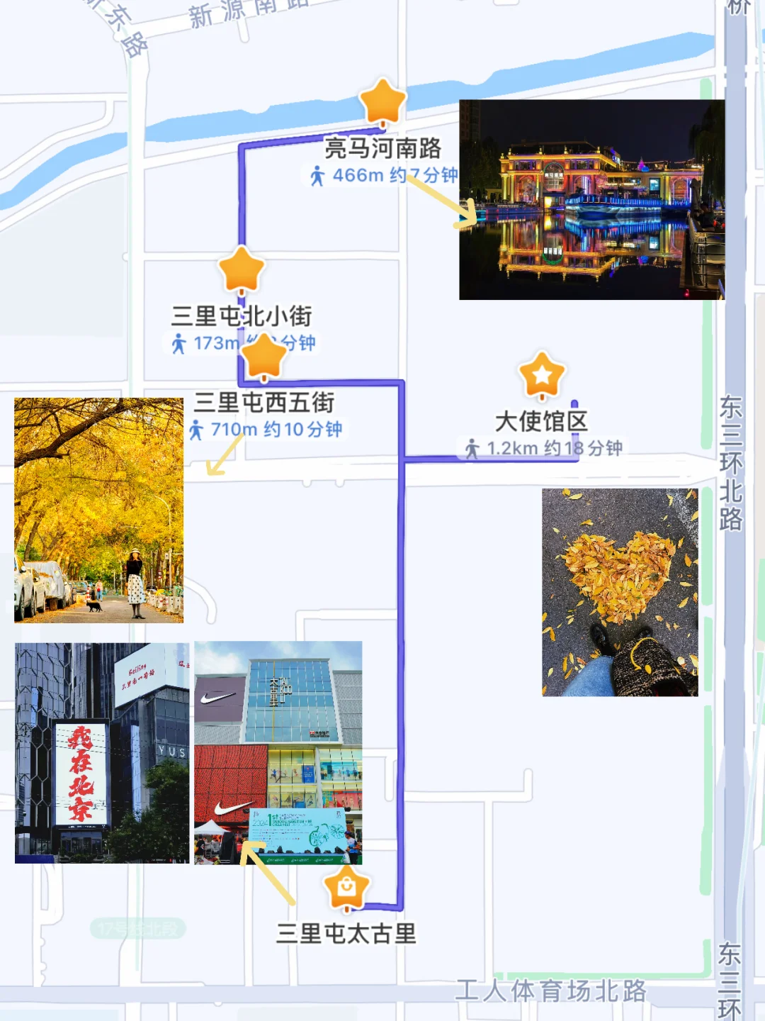 三里屯太古里🛍️ ➠ 使馆区 ➠ 三里屯西五街🍂 ➠ 三里屯北小街🍁 ➠ 亮马河🚤
