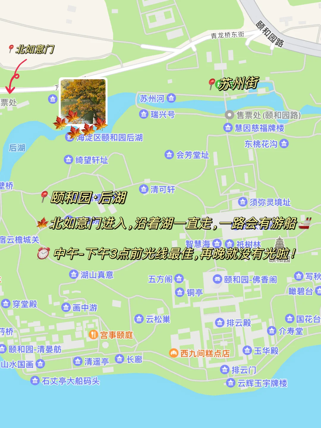 北宫门/北如意门进入➠沿着湖一直走➠后湖🍂区域➠苏州街➠北宫门出