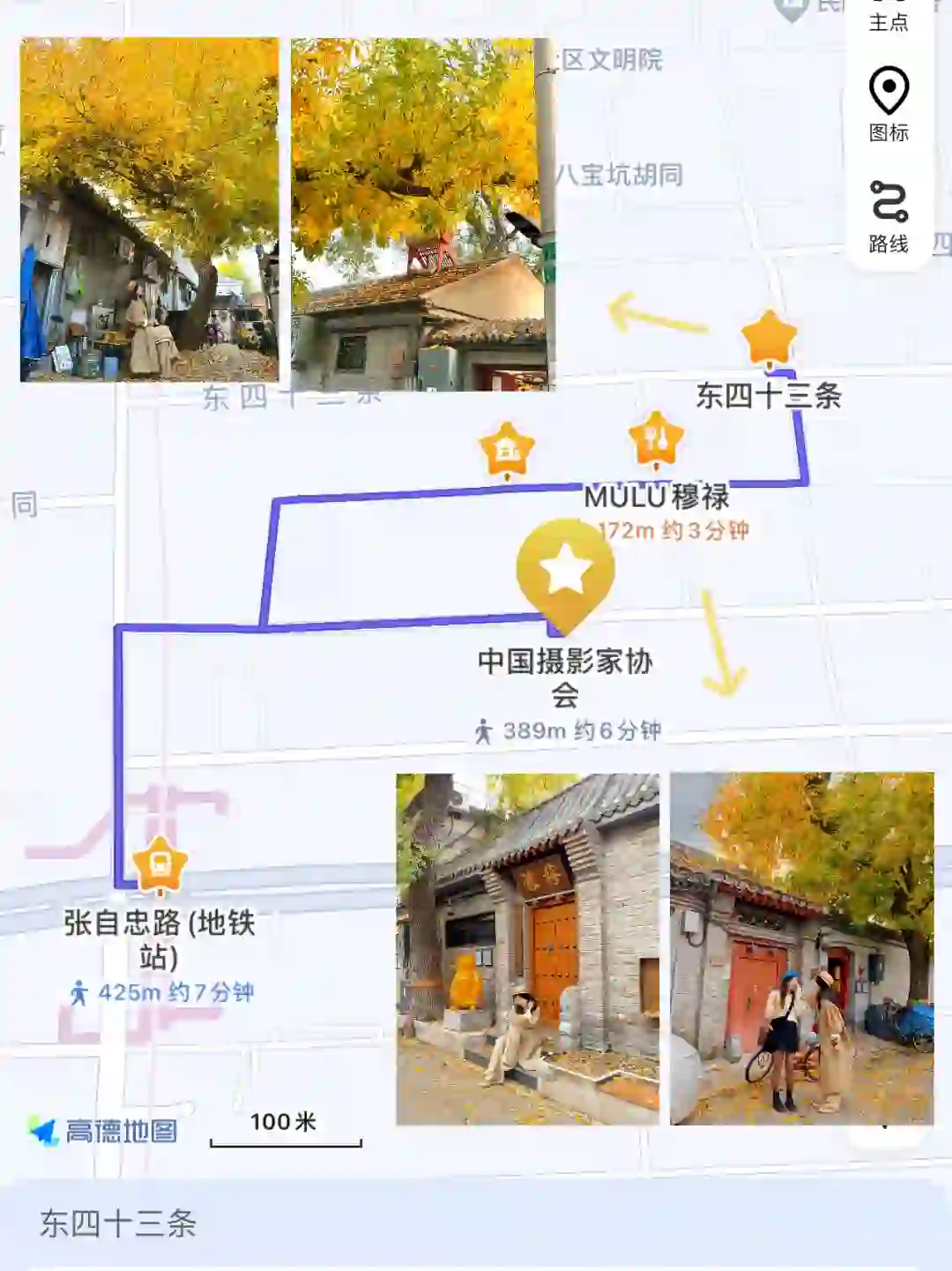 细管胡同 ➠ 东四十三条 ➠ 东四十二条 ➠ 辛寺胡同 ➠ 协作胡同 ➠ 东四北大街