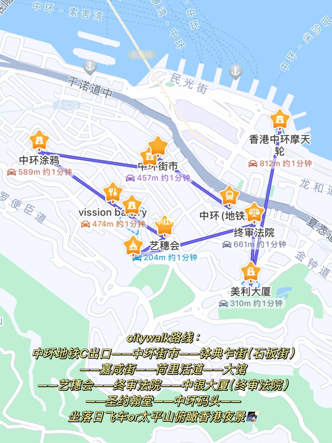 中环地铁🚇➠中环街市➠钵典乍街/石板街➠嘉咸街✍️➠荷里活道➠大馆➠艺穗会🎨➠终审法院➠圣约翰堂💒➠中环码头➠坐落日飞车/太平山俯瞰夜景🎑