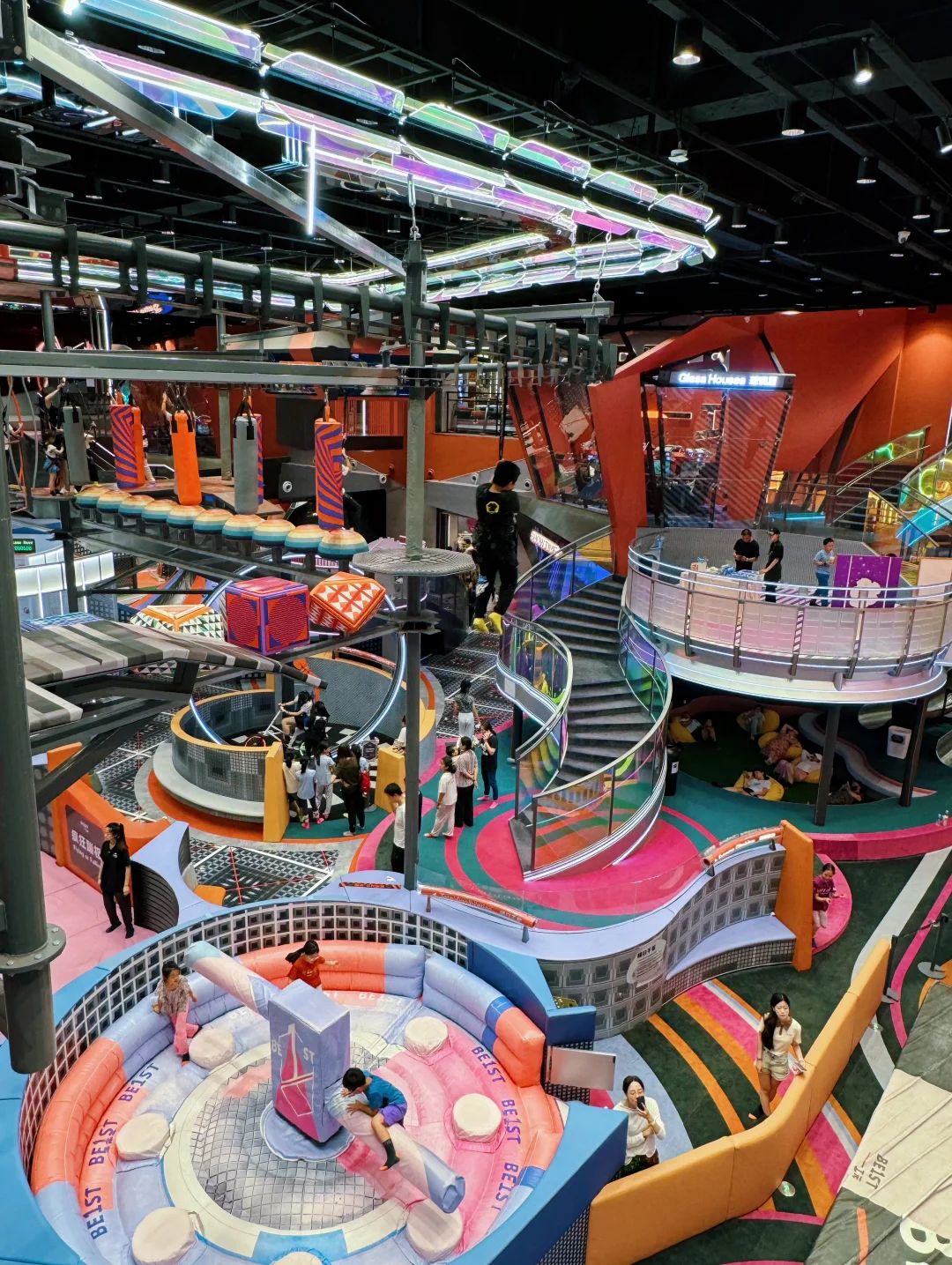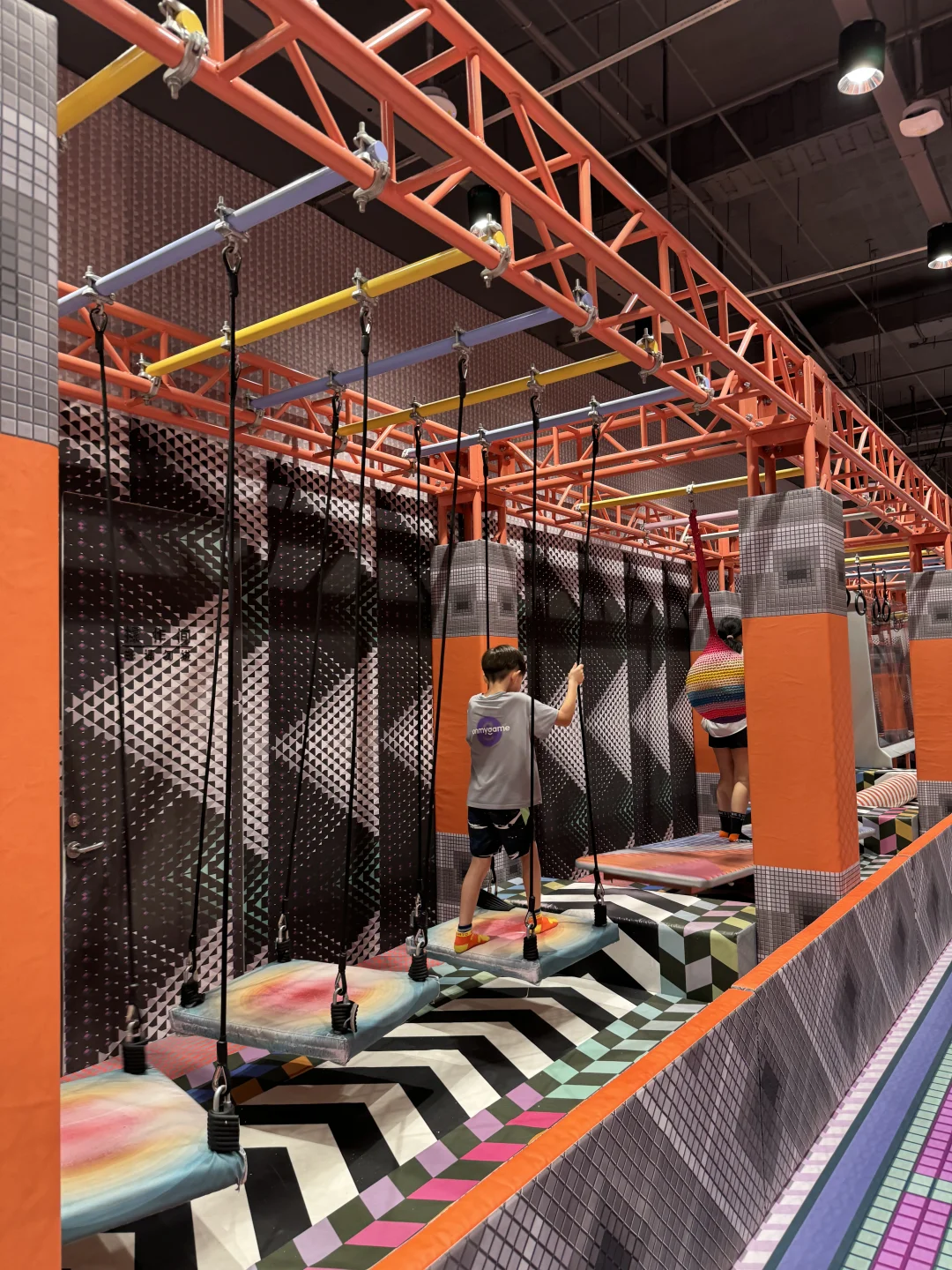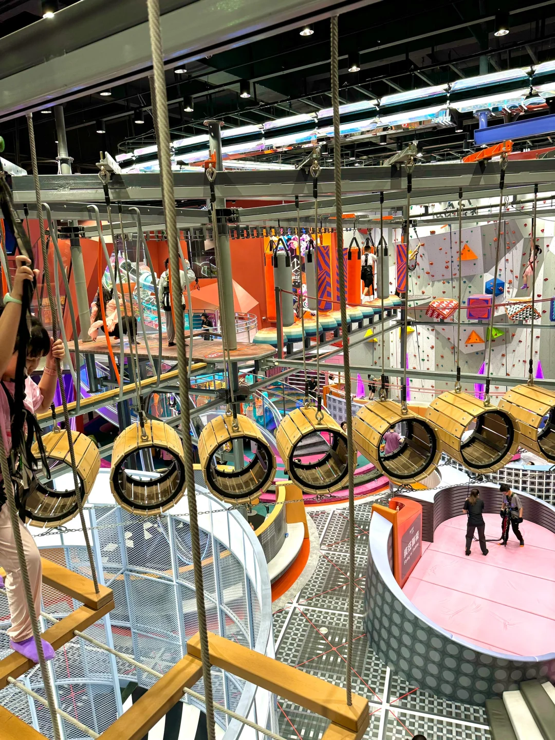 两层楼高度,有高空木桩、高空独木桥、急速滑轨…相当于把丛林冒险搬到了室内,原本就恐高的我瑟瑟发抖…🥹