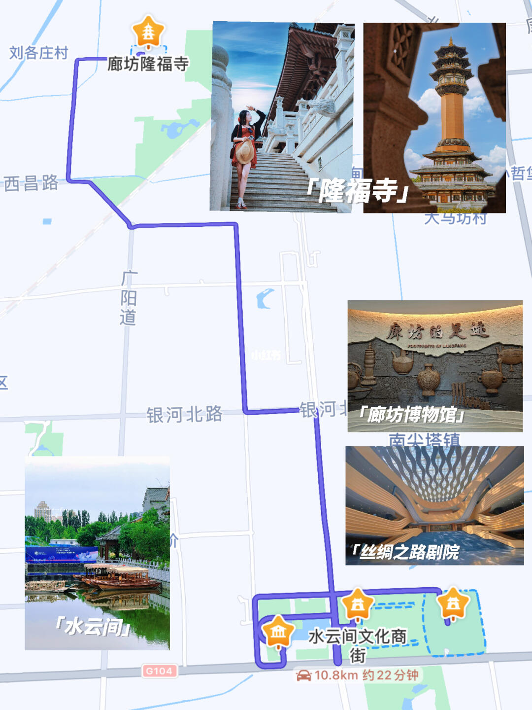 隆福寺📿 ➠ 廊坊博物馆📚 ➠ 水云间🍽️ ➠ 丝绸之路剧院🎞️