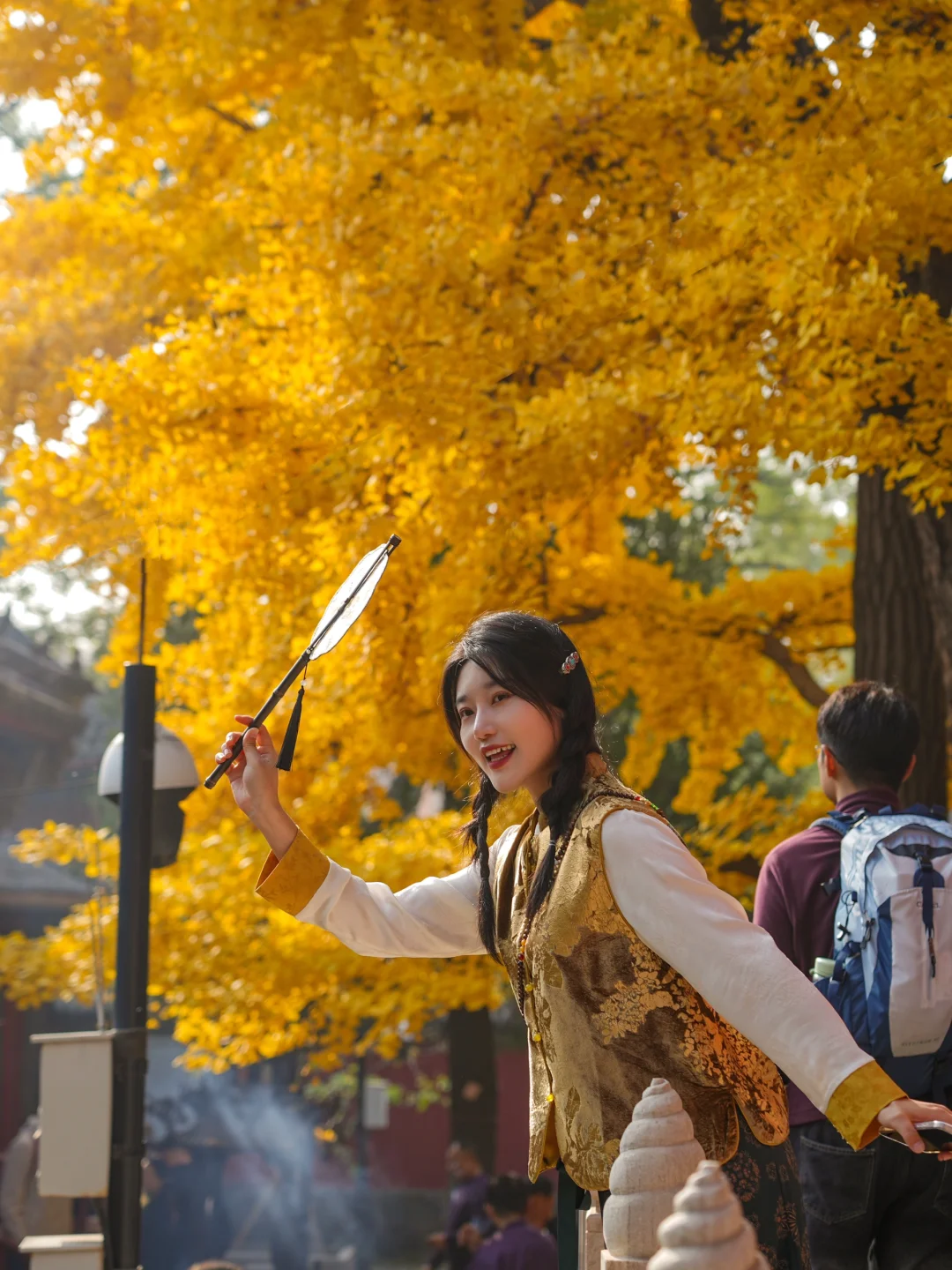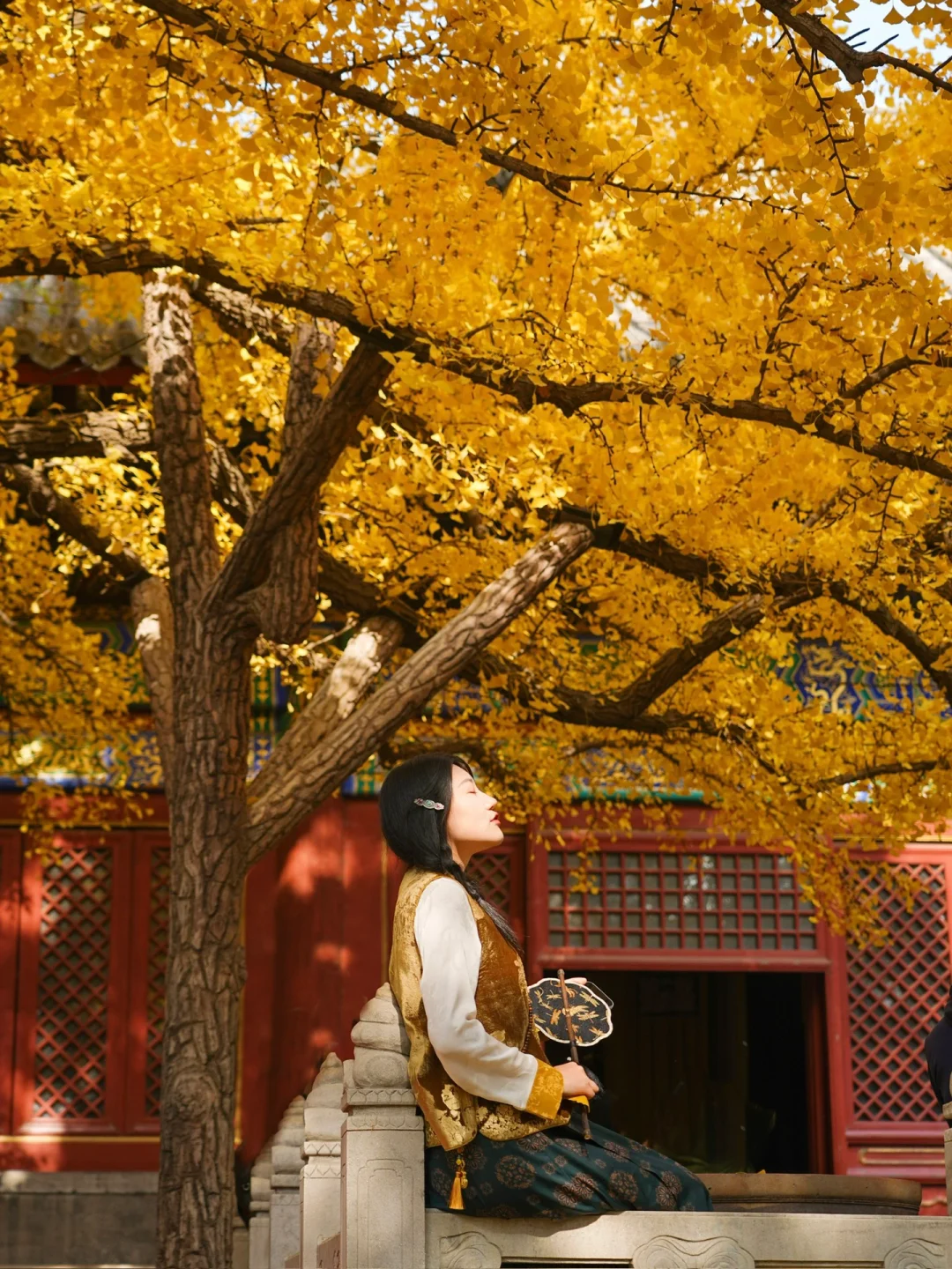 ❸ 大殿台阶上两侧取景,人物站/坐在栏杆上,银杏树为背景,人少好拍