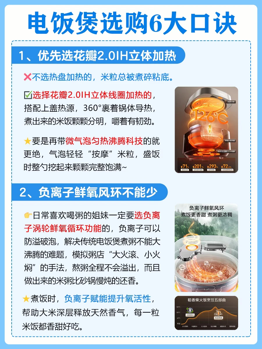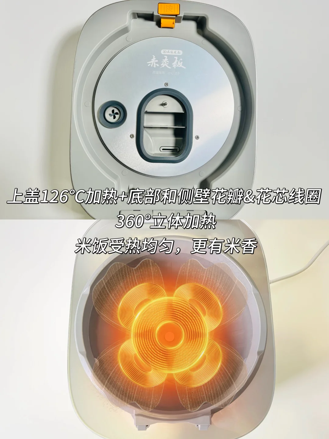 ✅花瓣2.0IH加热方式,底部四瓣花+花芯仿生线圈,侧壁线圈加高搭配上盖126℃热源补炊,米粒360°均匀受热。微气泡持续沸腾科技,避免暴力沸腾破坏米粒结构,盛饭时米粒颗颗完整蓬松,比外面餐馆的米饭还好吃!