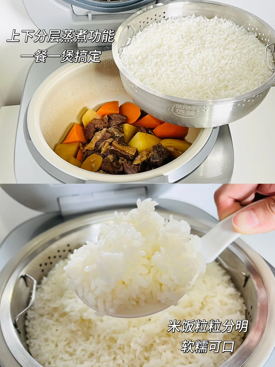 ✅配备食品级304不锈钢蒸笼,上下分层蒸煮功能,一餐一煲搞定,懒人福音!还能上蒸低升糖饭,下煮香甜杂粮饭。
