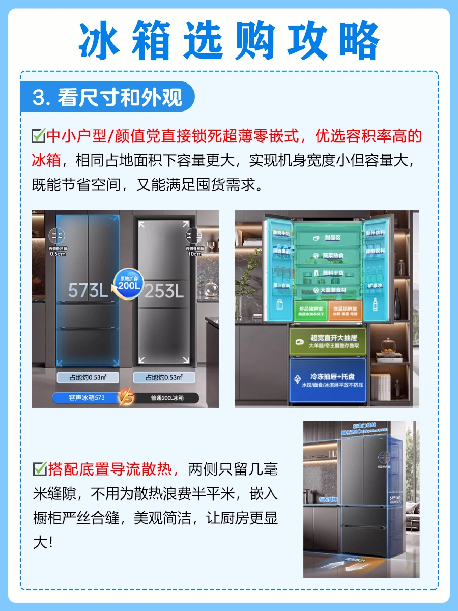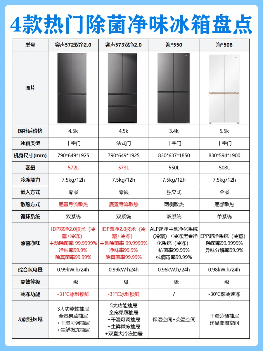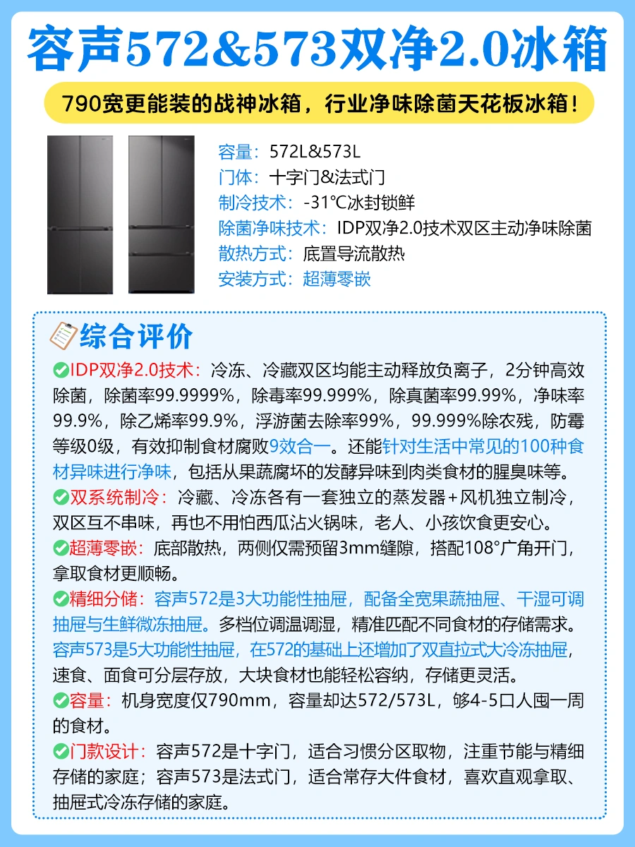 冰箱选不对,天天闹心!草莓沾排骨味、青菜放两天就霉,嵌入还凸出门板积灰,囤货更是乱成一团!这篇攻略帮你避坑,选到颜值实用双在线的冰箱! 1️⃣看净味除菌技术 选主动式净味除菌,主动捕捉病菌和异味,直接破坏蛋白质结构;还得看冷藏冷冻都能主动净味除菌的,防止冷冻区成健康死角! 2️⃣看循环系统 选双系统独立制冷的冰箱,从根源防串味、控温精准、节能又高效。 3️⃣看嵌入方式 中小户型/颜值党直接锁死超薄零嵌式,优选容积率高的冰箱,相同占地面积下容量更大,实现机身宽度小但容量大 。 4️⃣精细储存分区 选带有-31℃以下锁鲜技术,适合爱囤肉、常买海鲜的家庭。 优选配备功能性抽屉的,冷藏区:干湿度可调,食材各得其所;冷冻区:多分区精细存,囤货不混乱。 对比了4款热门冰箱,家庭爱囤货推荐容声573和容声572双净2.0,闭眼入不踩雷~ 🤩790宽更能装的战神冰箱!行业净味除菌天花板冰箱! ✅IDP双净2.0技术:冷冻、冷藏双区均能主动释放负离子,2分钟高效除菌,除菌率99.9999%,除毒率99.999%,除真菌率99.99%,净味率99.9%,除乙烯率99.9%,浮游菌去除率99%,99.999%除农残,防霉等级0级,有效抑制食材腐败9效合一。搭载IDP双净2.0能对生活中常见的100种食材异味进行净味,包括从果蔬腐坏的发酵异味到肉类食材的腥臭味等。 ✅双系统:冷藏、冷冻各有一套独立的蒸发器+风机独立制冷,双区互不串味,再也不用怕西瓜沾火锅味,老人、小孩饮食更安心。 ✅超薄零嵌:底部散热,两侧仅需预留3mm缝隙,搭配108°广角开门,拿取食材更顺畅。 ✅精细分储:容声 573是法式门配备5大功能性抽屉,双直拉式大冷冻抽屉,速食、面食可分层存放,大块食材也能轻松容纳,存储更灵活。572则是十字门,有3大功能性抽屉,全宽果蔬抽屉、干湿可调抽屉与生鲜微冻抽屉,精准匹配不同食材的存储需求。 ✅容量:机身宽度仅790mm,容量却达572/573L,比同占地冰箱扩容20L容量,够4-5口人囤一周的食材。 👍🏻容声还成为2026世界杯™全球官方赞助商,42年专研冰箱的品牌逐渐走向国际,品质得到认可,售后也很有保障~心动的宝子们可以趁这波guo补拿下哦!