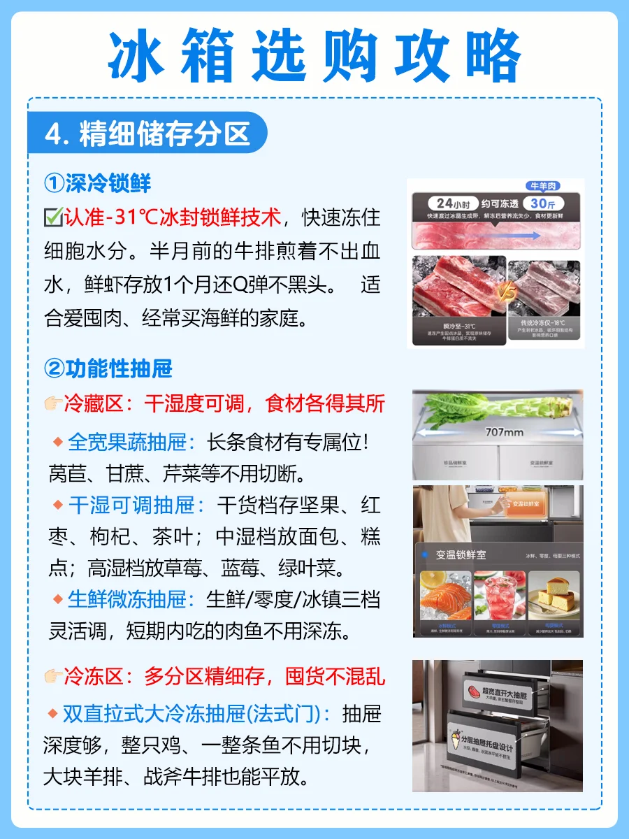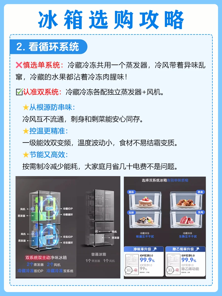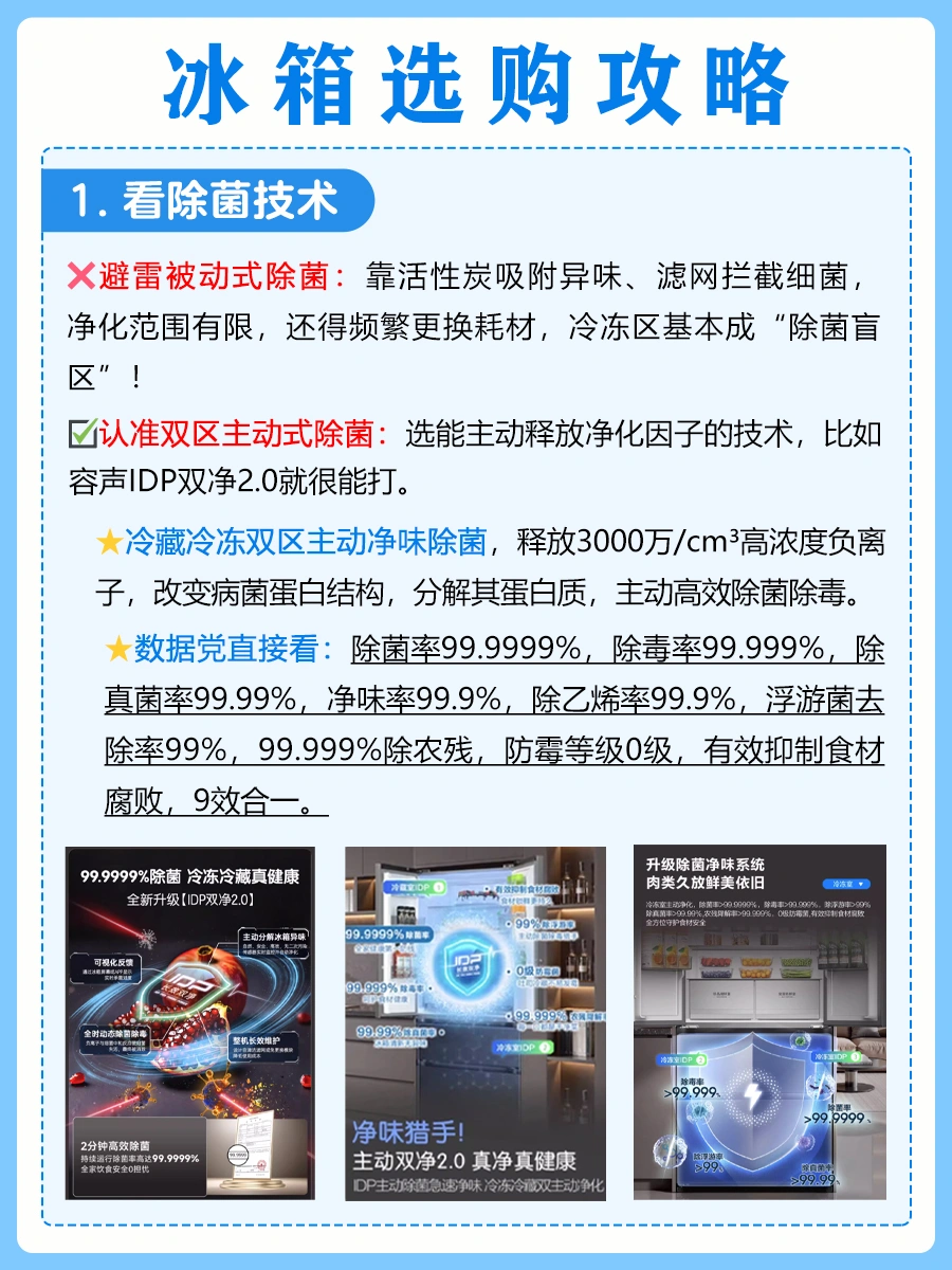 冰箱选不对,天天闹心!草莓沾排骨味、青菜放两天就霉,嵌入还凸出门板积灰,囤货更是乱成一团!这篇攻略帮你避坑,选到颜值实用双在线的冰箱! 1️⃣看净味除菌技术 选主动式净味除菌,主动捕捉病菌和异味,直接破坏蛋白质结构;还得看冷藏冷冻都能主动净味除菌的,防止冷冻区成健康死角! 2️⃣看循环系统 选双系统独立制冷的冰箱,从根源防串味、控温精准、节能又高效。 3️⃣看嵌入方式 中小户型/颜值党直接锁死超薄零嵌式,优选容积率高的冰箱,相同占地面积下容量更大,实现机身宽度小但容量大 。 4️⃣精细储存分区 选带有-31℃以下锁鲜技术,适合爱囤肉、常买海鲜的家庭。 优选配备功能性抽屉的,冷藏区:干湿度可调,食材各得其所;冷冻区:多分区精细存,囤货不混乱。 对比了4款热门冰箱,家庭爱囤货推荐容声573和容声572双净2.0,闭眼入不踩雷~ 🤩790宽更能装的战神冰箱!行业净味除菌天花板冰箱! ✅IDP双净2.0技术:冷冻、冷藏双区均能主动释放负离子,2分钟高效除菌,除菌率99.9999%,除毒率99.999%,除真菌率99.99%,净味率99.9%,除乙烯率99.9%,浮游菌去除率99%,99.999%除农残,防霉等级0级,有效抑制食材腐败9效合一。搭载IDP双净2.0能对生活中常见的100种食材异味进行净味,包括从果蔬腐坏的发酵异味到肉类食材的腥臭味等。 ✅双系统:冷藏、冷冻各有一套独立的蒸发器+风机独立制冷,双区互不串味,再也不用怕西瓜沾火锅味,老人、小孩饮食更安心。 ✅超薄零嵌:底部散热,两侧仅需预留3mm缝隙,搭配108°广角开门,拿取食材更顺畅。 ✅精细分储:容声 573是法式门配备5大功能性抽屉,双直拉式大冷冻抽屉,速食、面食可分层存放,大块食材也能轻松容纳,存储更灵活。572则是十字门,有3大功能性抽屉,全宽果蔬抽屉、干湿可调抽屉与生鲜微冻抽屉,精准匹配不同食材的存储需求。 ✅容量:机身宽度仅790mm,容量却达572/573L,比同占地冰箱扩容20L容量,够4-5口人囤一周的食材。 👍🏻容声还成为2026世界杯™全球官方赞助商,42年专研冰箱的品牌逐渐走向国际,品质得到认可,售后也很有保障~心动的宝子们可以趁这波guo补拿下哦!