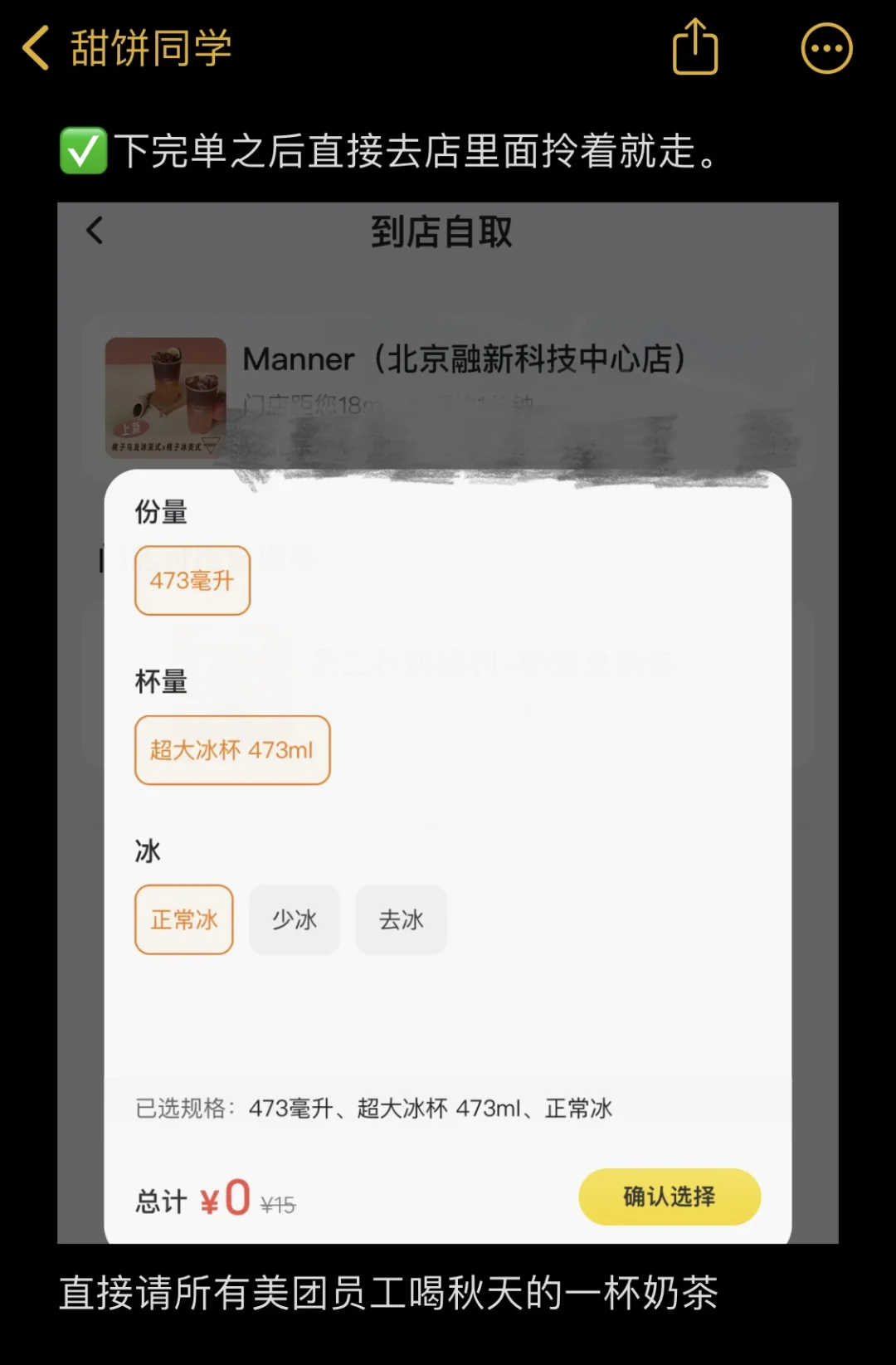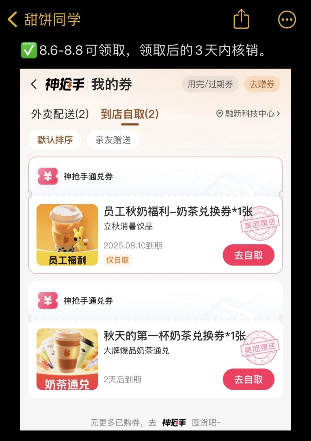 众所周知,美团的福利在第一梯队的大厂里一直处于相对弱势。尽管如此,美团也努力使开水变甜。 最近注意到美团外卖请员工喝秋天第一杯奶茶。8.6-8.8可领取,领取后的3天内核销。下完单之后直接去店里面拎着就走。 直接请所有美团员工喝秋天的一杯奶茶,这一波的员工反响大部分还是挺积极的,看网上有人说开水团开始掺糖了。在现在这大环境下,还能给员工关怀加码的公司已经很赞了。