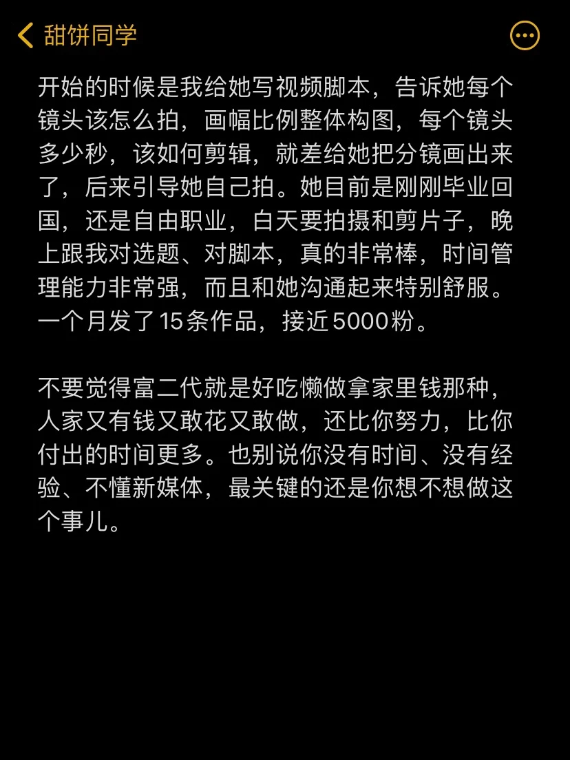 每天一个自媒体运营知识2️⃣4️⃣9️⃣ 我陪跑开了有5个月了,很多人都想做ip,大部分人是光想不干。但是我发现留学生和富二代真的特别适合做IP,聪明好学,敢想敢做,胆子大敢花钱。到目前为止这两个群体报ip孵化的有12位,成功率还是100%,而且教起来是真的容易,一点就通。当然了,这和她们本身的认知水平高也有很大的关系。