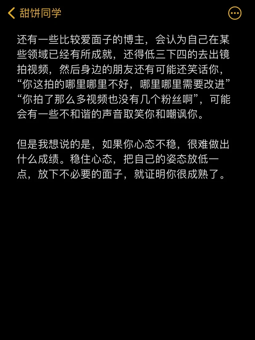 每天一个自媒体运营知识1️⃣7️⃣1️⃣ 做自媒体博主心态一定要稳。我见过太多的博主会因为数据焦虑,甚至茶饭不思每天掉头发。其实做自媒体博主本来就不是一件容易的事,尤其是新手博主自己慢慢摸索的过程,一定会走很多很多弯路,没有人指点,就需要自己去试错和碰壁。一旦开始出现焦虑情绪,会让你钻牛角尖,影响你的创作和判断,甚至影响你的日常工作和生活。如果这种焦虑情绪无法平复,大概率是做不成的。