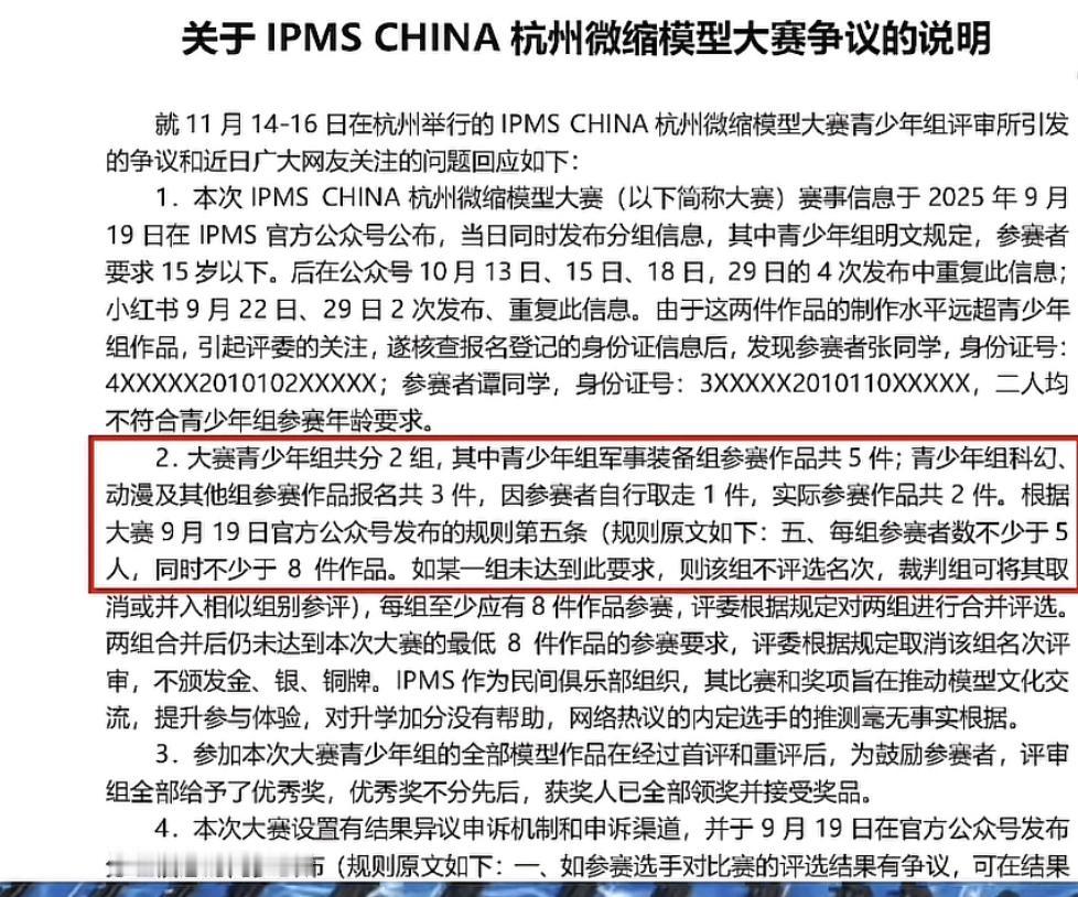 小孩哥只是因为输掉比赛,父亲竟当场怒怼主办方。本以为是他们比赛输不起,结果看到第一名和第二名的作品后,才知道这哪是什么比赛,分明就是拼背景。网友们也因此纷纷质疑比赛的公平性,也同时为这位父亲霸气护子的行为点赞。 事后主办方也第一时间做了澄清。说此次青少年大赛共两组,但两组青少年组作品加起来都不足八件,达不到比赛评比要求,因此该组取消了评选名称,但是主办方想着来都来了,就给小朋友们鼓励一下,就全部给了优秀奖,排名不分先后。 而这位小孩哥的年龄已达15岁,已经超过青少年组的年龄限制,并且作品以日本在密苏里号投降为主题,构思与制作无可挑剔,就算放在成人组也毫不逊色。因水平太高不像15岁所做被主办方质疑其真实性。 小孩哥精心准备了4个月,不断的打磨的作品,从广东远赴赛场,4个月的心血被轻易质疑,孩子当场情绪崩溃哭了起来,看着自家孩子被欺负了,父亲当场发飙。事后有部分奖品侠在网络上对小孩哥及其父亲说了一些不好听的话。而这位父亲也没有选择退缩。而是直接录视频条理清晰地陈述事实,硬刚那些键盘侠,用最直接的方式给孩子上了人生第一堂社会实践课,坚守热爱无需怯懦,面对不公要敢发声,比起一纸奖状,这份直面现实的勇气才是孩子一生的财富。