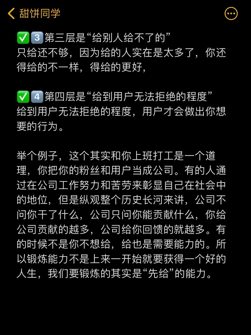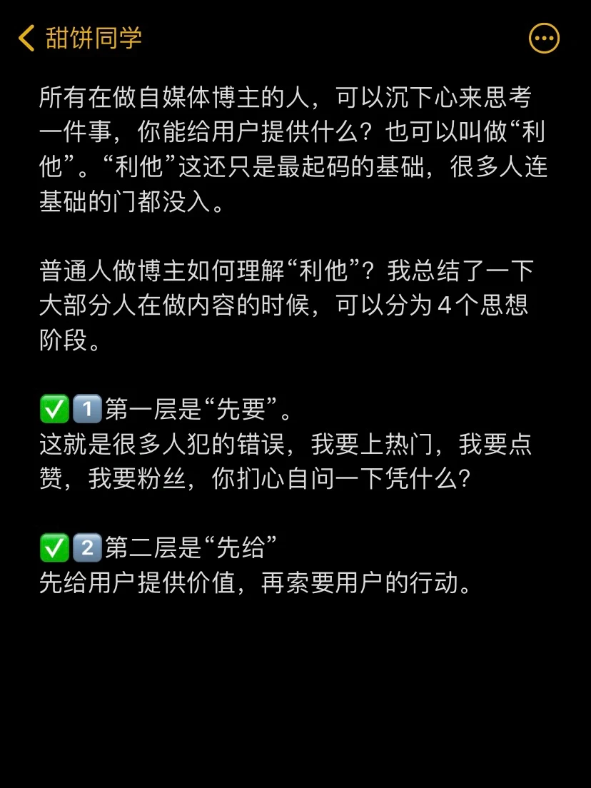 每天一个自媒体运营知识2️⃣3️⃣6️⃣ 做不好自媒体博主的人,往往都犯了一个错误,叫“先要”。而做好“自媒体博主”的人都做对了一件事情,叫做“先给”。最近陪跑了一位做摄影赛道的博主,他做的是摄影付费课程+课后咨询一对一答疑变现的,我有很深的感悟。