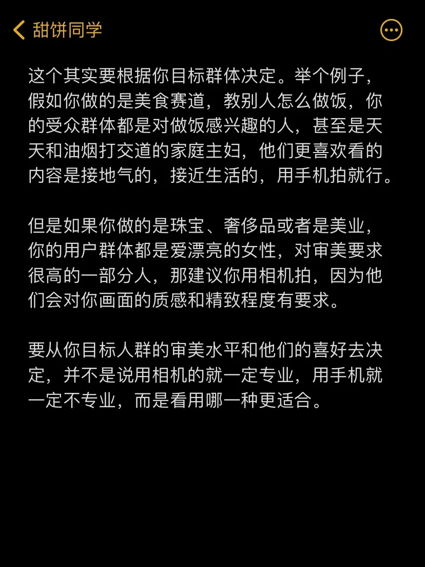 每天一个自媒体运营知识2️⃣2️⃣2️⃣ 我发现很多做短视频的博主都会纠结一个问题,拍视频到底是用手机拍好?还是用相机拍好?用相机拍操作比较复杂,又担心画面拍的太精致反而不好,因为专业是流量的敌人。用手机拍了又觉得画质不够好,显得不高端。