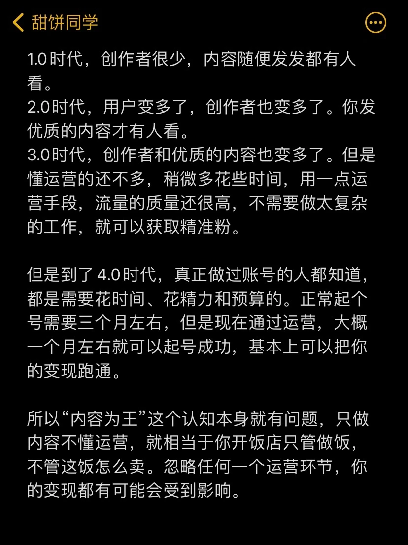 每天一个自媒体运营知识1️⃣7️⃣6️⃣ 看到很多人和我说“自媒体内容为王,运营没用”。如果说前几年你这么说完全没问题,那个时候内容创作者还不多,大部分都是做内容起来的。但是今年如果说还有人告诉你“内容为王”。你可以直接反问他,问他最近有没有只做内容就能起来并且变现的账号。优质的内容肯定是基础,但同样重要的是,你怎样通过运营去做好你的变现。