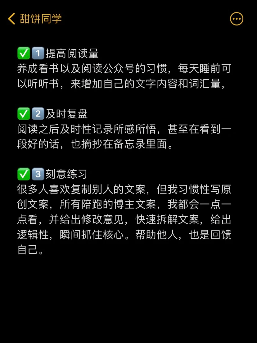每天一个自媒体运营知识2️⃣1️⃣3️⃣ 全网都在教你速成的方法,我并不是说这种速成方法完全没有效果,会有效果,但是那是在某个阶段。这条笔记整理了一些实实在在的干货,我常用的提高文案能力的方法。