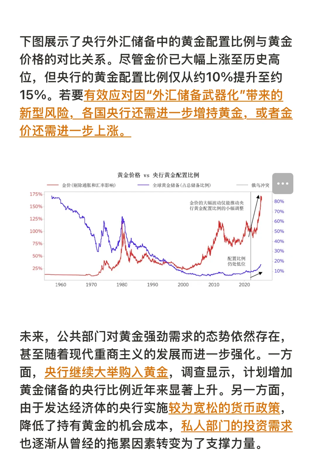 当前,提升黄金作为财富储藏手段的吸引力的多项条件,似乎依然稳固,并且多数市场参与者尚未大幅调整对黄金的配置。虽然对俄制裁已不再是市场近期关注的焦点,但其释放的核心信号(即法定货币储备可能被“武器化”)不仅未消失,反而随着现代重商主义的发展而更加明显。尽管央行大幅增持黄金,但由于外汇储备总量庞大,黄金在总储备中的占比仅上升了约5%-10%。此外,除了各国央行,其他市场参与者也可能更倾向于持有黄金,减少法定货币储蓄。