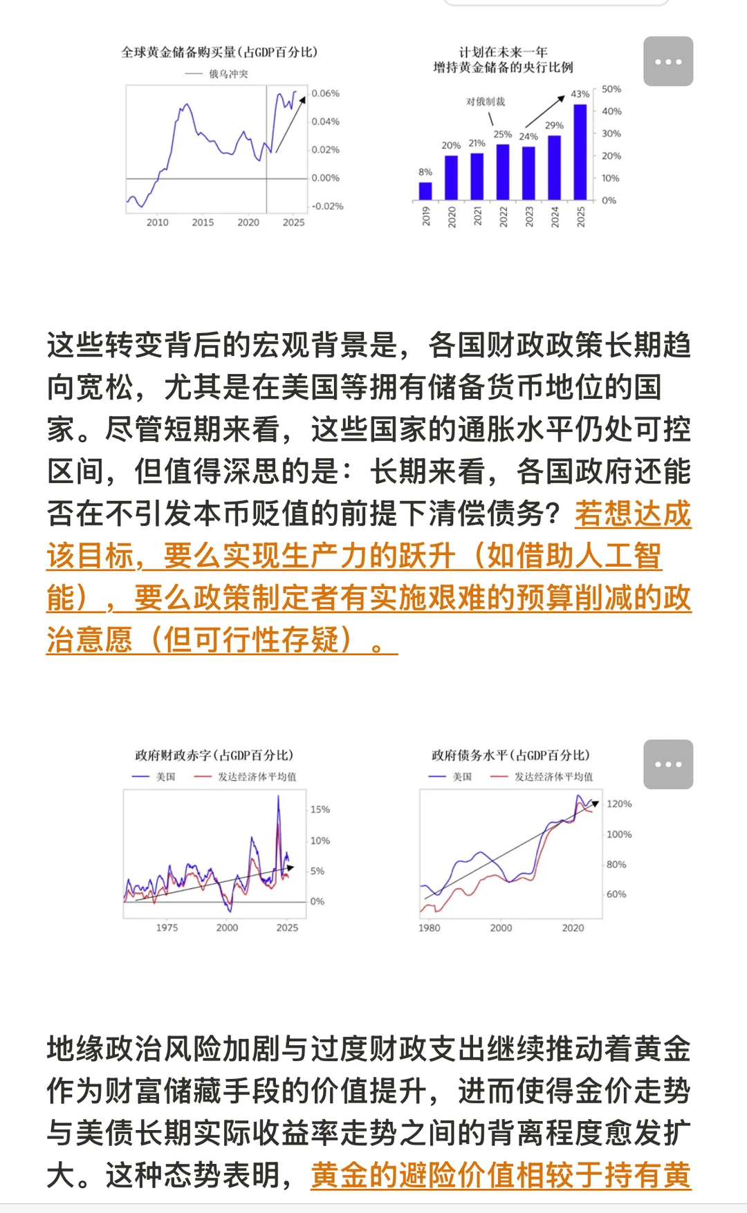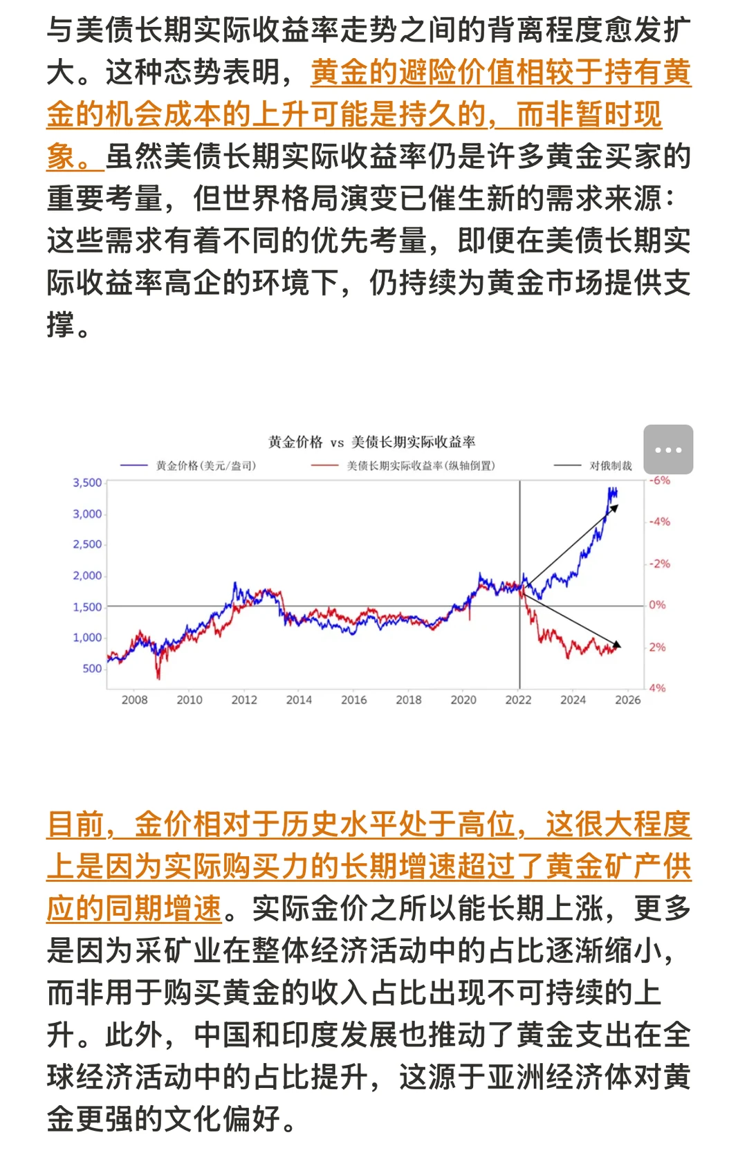 黄金是一种无负债属性的资产,也不产生“利息收益”,因此黄金价格的变动主要取决于其避险价值相对于持有成本(因持有黄金而放弃其他资产所产生的机会成本)的变化。俄乌冲突爆发后西方国家冻结俄罗斯资产的行为,加剧了众多储户对法定货币储蓄风险的担忧,而这导致的转变需较长时间才能充分反映在市场定价中。冲突爆发后,非西方国家的央行大幅增持黄金,推动金价从约2000美元/盎司上涨至约3400美元/盎司,涨幅达到了70%左右。