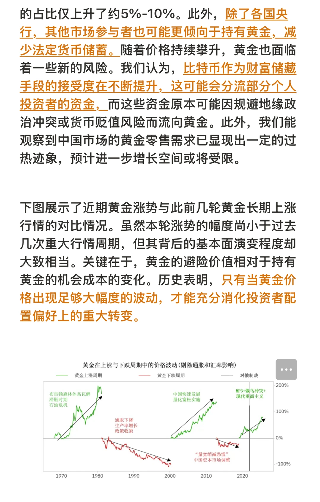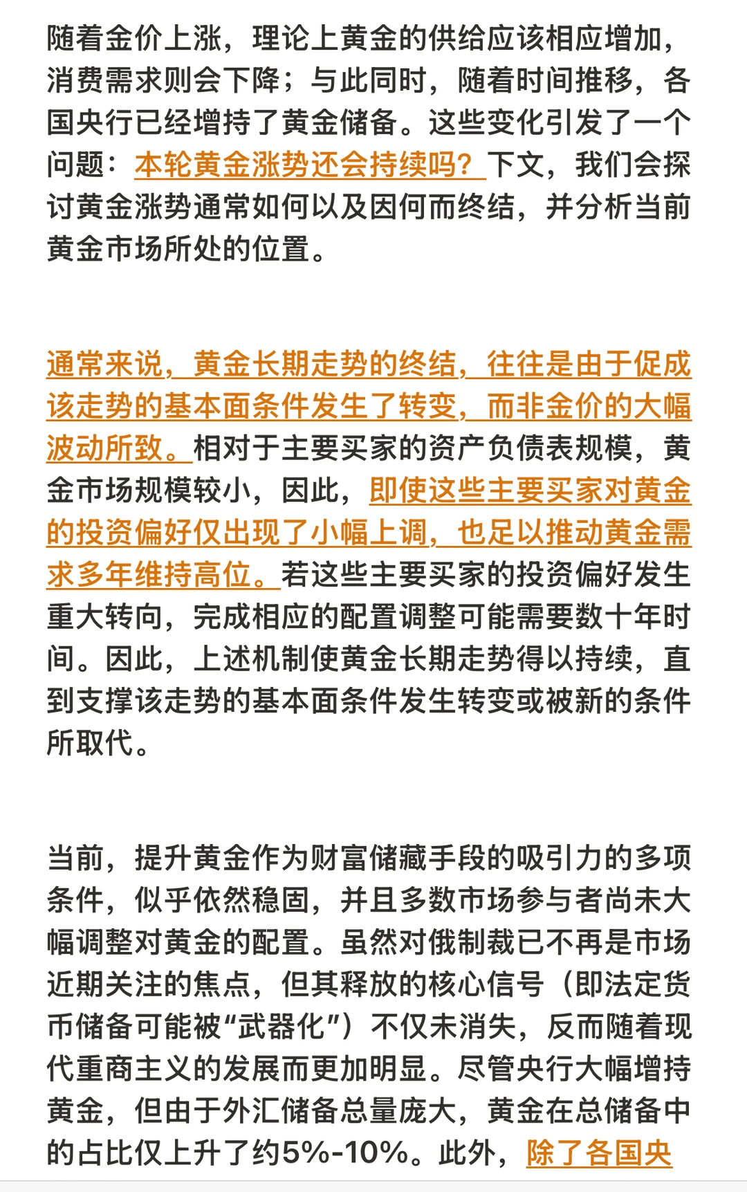 通常来说,黄金长期走势的终结,往往是由于促成该走势的基本面条件发生了转变,而非金价的大幅波动所致。相对于主要买家的资产负债表规模,黄金市场规模较小,因此,即使这些主要买家对黄金的投资偏好仅出现了小幅上调,也足以推动黄金需求多年维持高位。若这些主要买家的投资偏好发生重大转向,完成相应的配置调整可能需要数十年时间。因此,上述机制使黄金长期走势得以持续,直到支撑该走势的基本面条件发生转变或被新的条件所取代。
