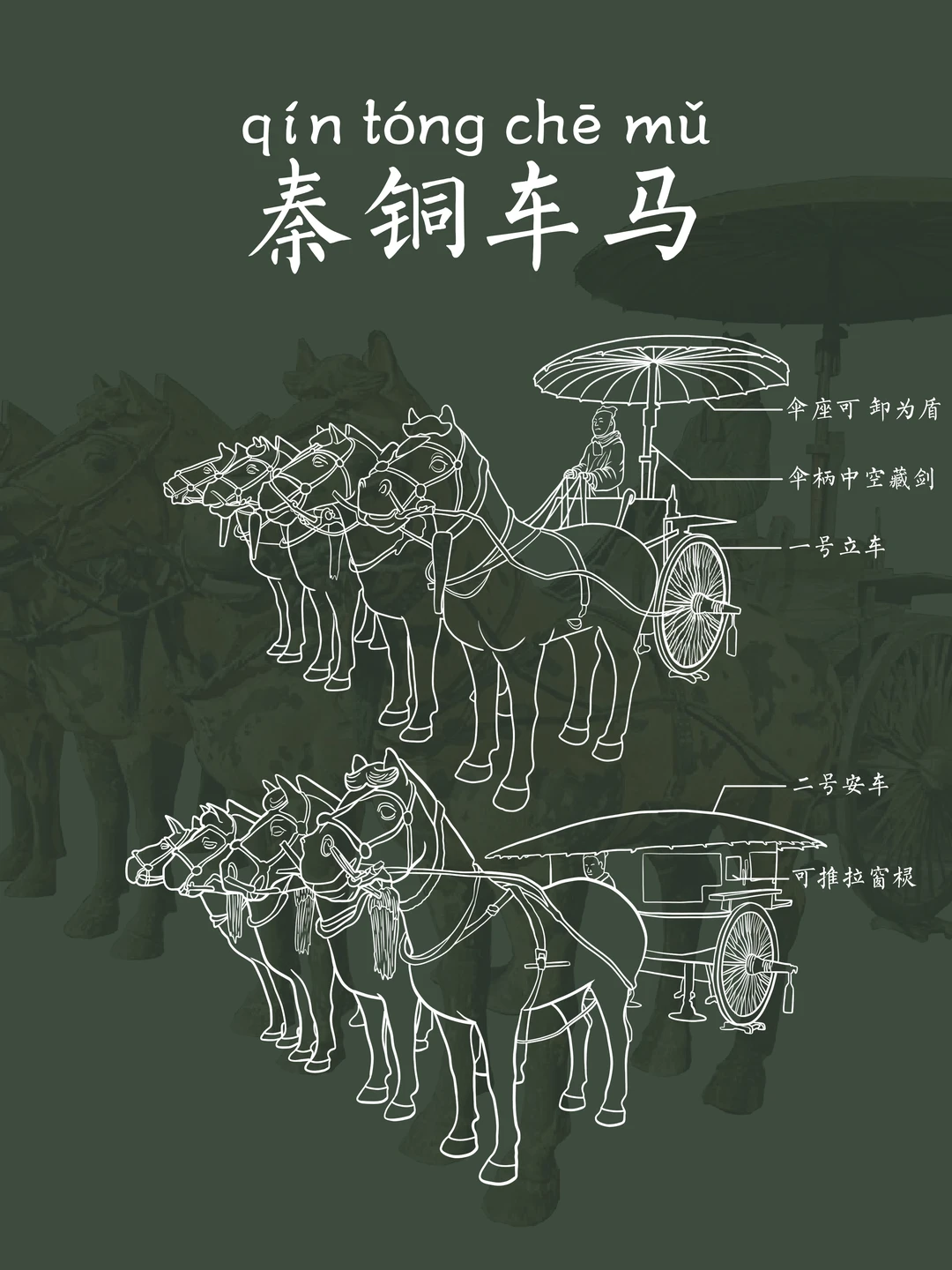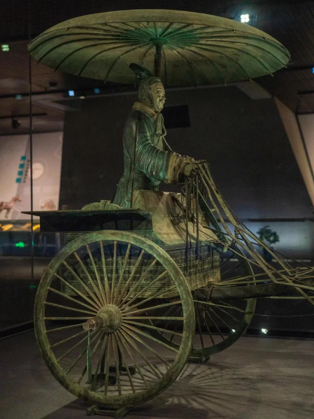 📍车轮30根辐条象征日月轮转,伞盖圆穹代表“天”,车厢方形象征“地”,体现秦人“天圆地方”的宇宙哲学。车轴与车辕间的“伏兔”部件,通过木质缓冲层减少颠簸,堪称秦代“悬挂系统”。