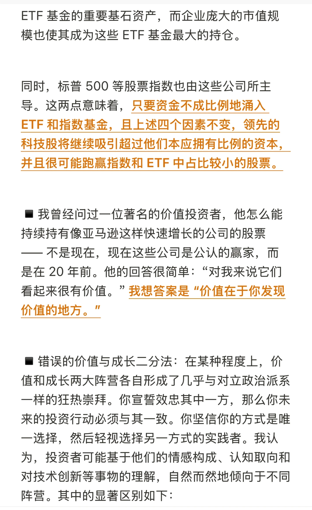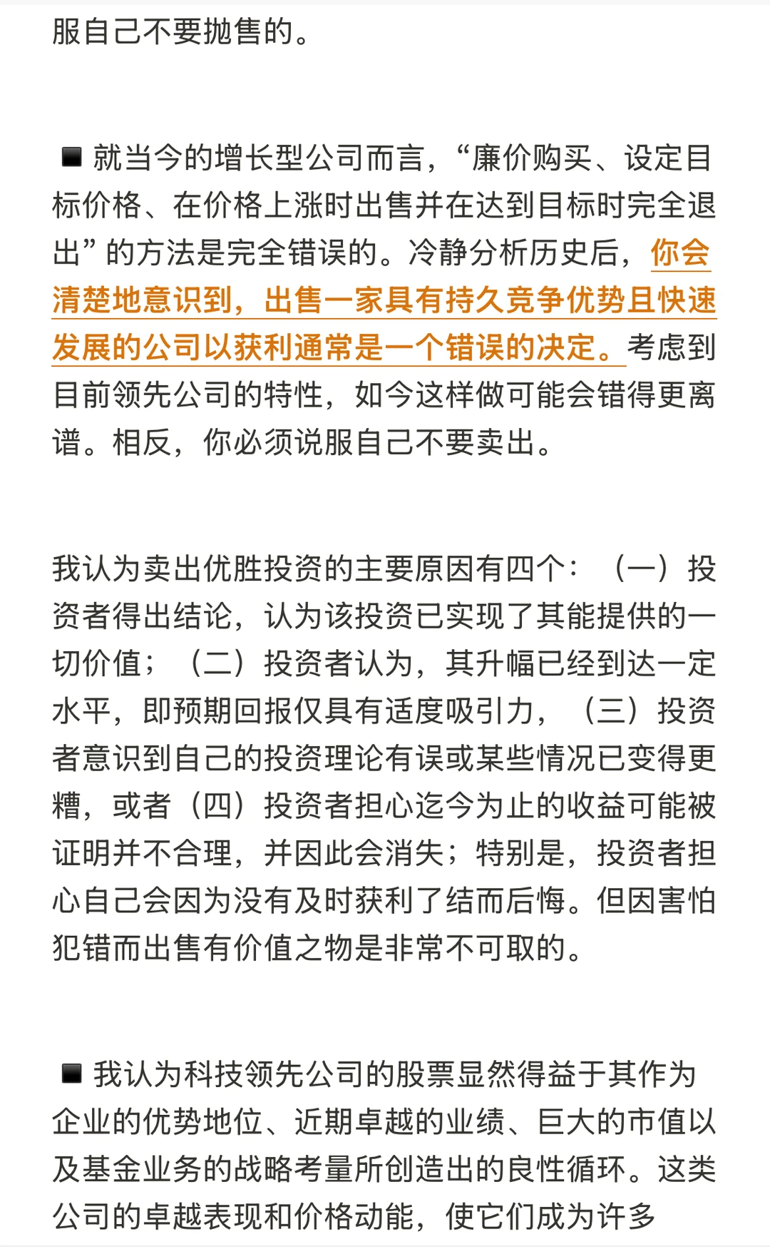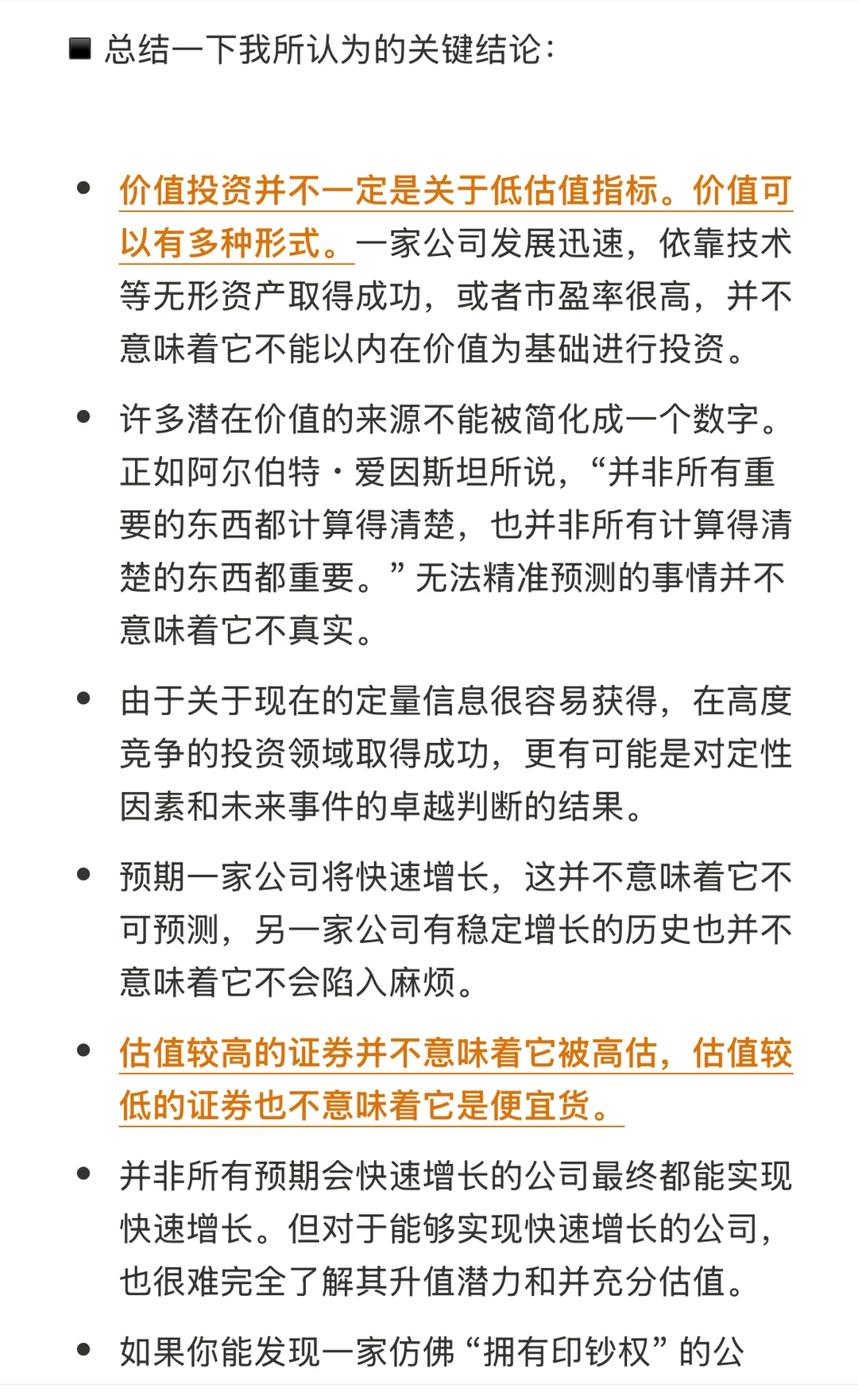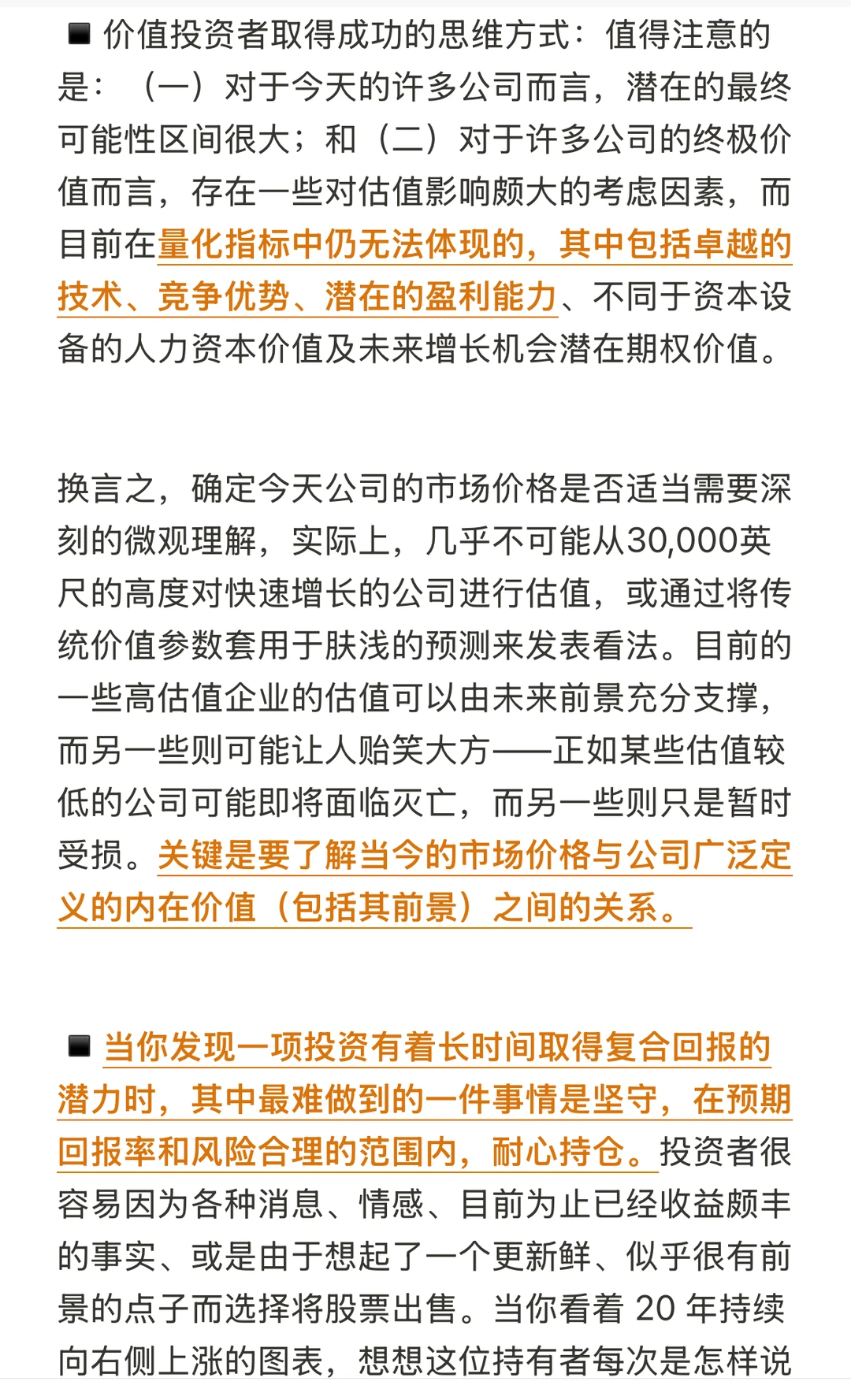 ▪️价值投资者取得成功的思维方式:值得注意的是:(一)对于今天的许多公司而言,潜在的最终可能性区间很大;和(二)对于许多公司的终极价值而言,存在一些对估值影响颇大的考虑因素,而目前在量化指标中仍无法体现的,其中包括卓越的技术、竞争优势、潜在的盈利能力、不同于资本设备的人力资本价值以及未来增长机会的潜在期权价值。