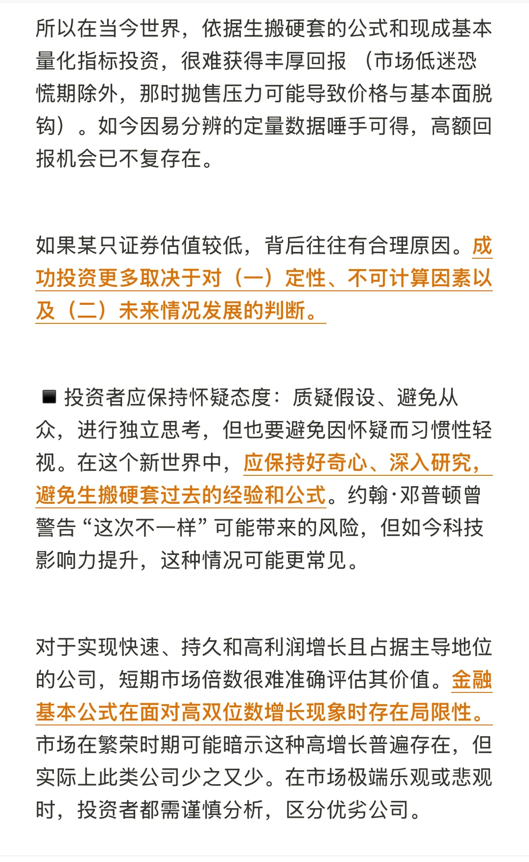 所以当今世界,依据生搬硬套的公式和现成基本量化指标投资,很难获得丰厚回报 (市场低迷恐慌期除外,那时抛售压力可能导致价格与基本面脱钩)。如今因易分辨的定量数据唾手可得,高额回报机会已不复存在。