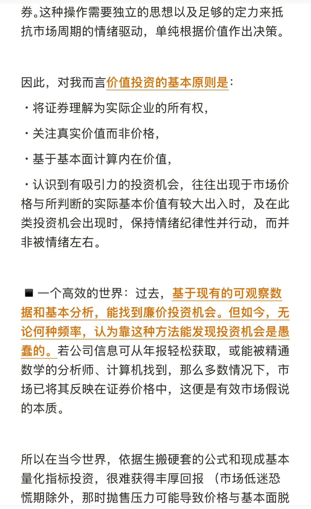 ▪️一个高效的世界:过去基于现有的可观察数据和基本分析,能找到廉价投资机会。但如今无论何种频率,认为靠这种方法能发现投资机会是愚蠢的。若公司信息可从年报轻松获取,或能被精通数学的分析师、计算机找到,那么多数情况下,市场已将其反映在证券价格中,这便是有效市场假说的本质。