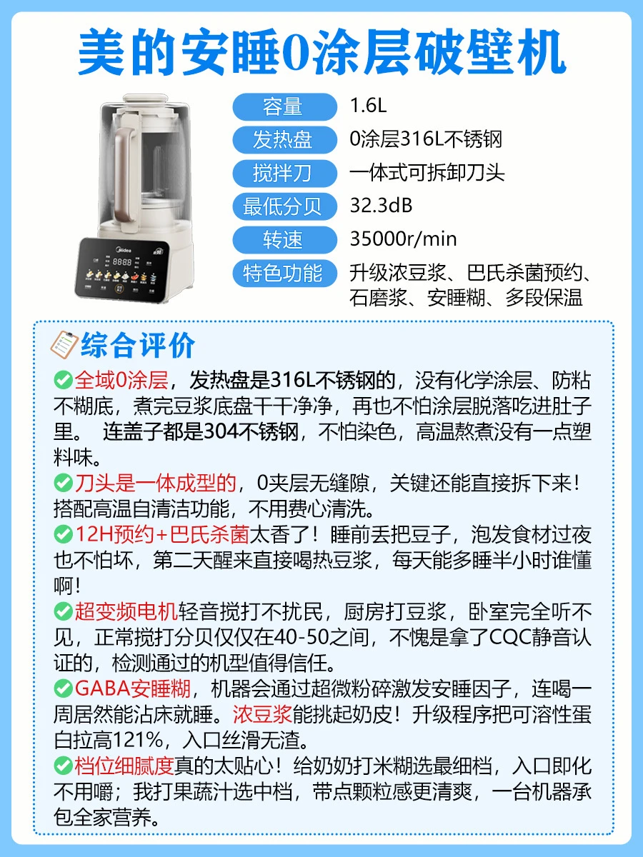 ✨我自留款是美的安睡0涂层破壁机fc12pro,主要是看中它是316L不锈钢发热盘+304不锈钢顶盖,有娃👶🏻家庭用着才放心!👏🏻一体成型0夹层可拆卸刀头,搭配高温自清洁功能,不用费心清洗。12H预约+循环巴氏杀菌🦠太香了!睡前丢把豆子,第二天醒来直接喝热豆浆,每天能多睡半小时!运行噪音最低只有32.3db,真的敲静音。还有GABA安睡糊程序💤,浓豆浆模式搅打出来的豆浆入口丝滑无渣,还能挑起奶皮!