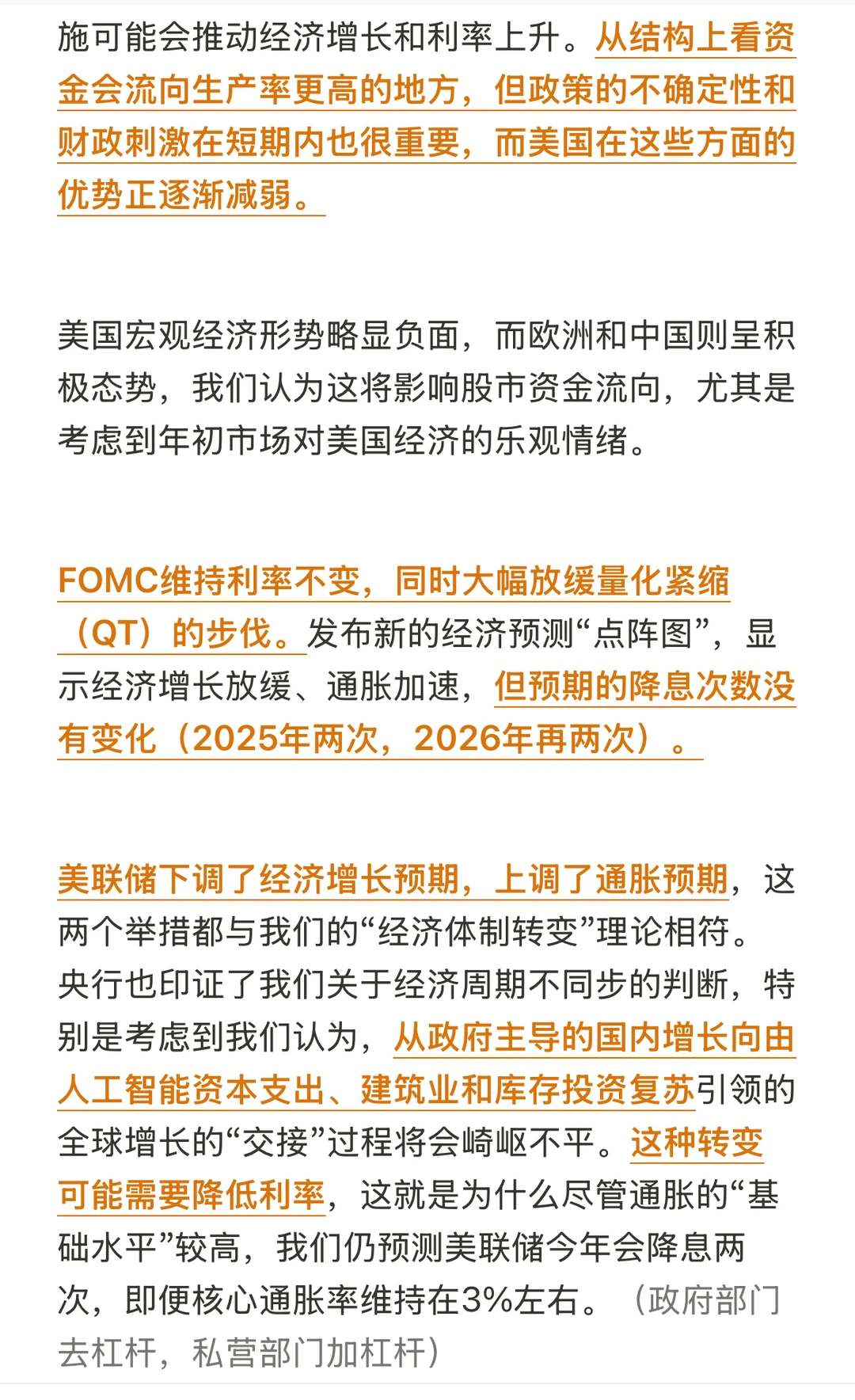 美联储下调了经济增长预期,上调了通胀预期,这两个举措都与我们的“经济体制转变”理论相符。央行也印证了我们关于经济周期不同步的判断,特别是考虑到我们认为,从政府主导的国内增长向由人工智能资本支出、建筑业和库存投资复苏引领的全球增长的“交接”过程将会崎岖不平。这种转变可能需要降低利率,这就是为什么尽管通胀的“基础水平”较高,我们仍预测美联储今年会降息两次,即便核心通胀率维持在3%左右。(政府部门去杠杆,私营部门加杠杆)