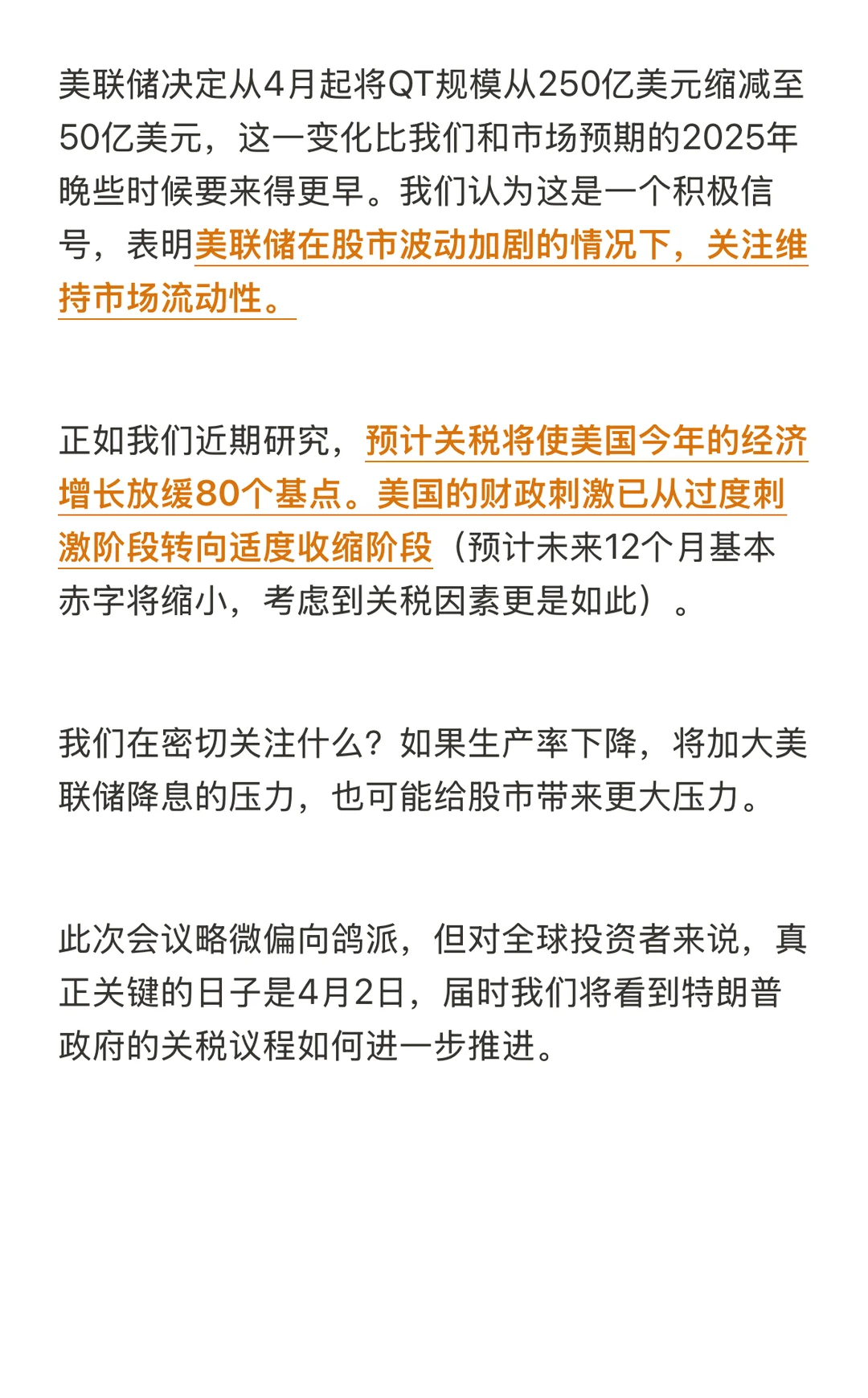 美联储决定从4月起将QT规模从250亿美元缩减至50亿美元,这比我们和市场预期的2025年晚些时候要来得更早。我们认为这是一个积极信号,表明美联储在股市波动加剧的情况下,关注维持市场流动性。