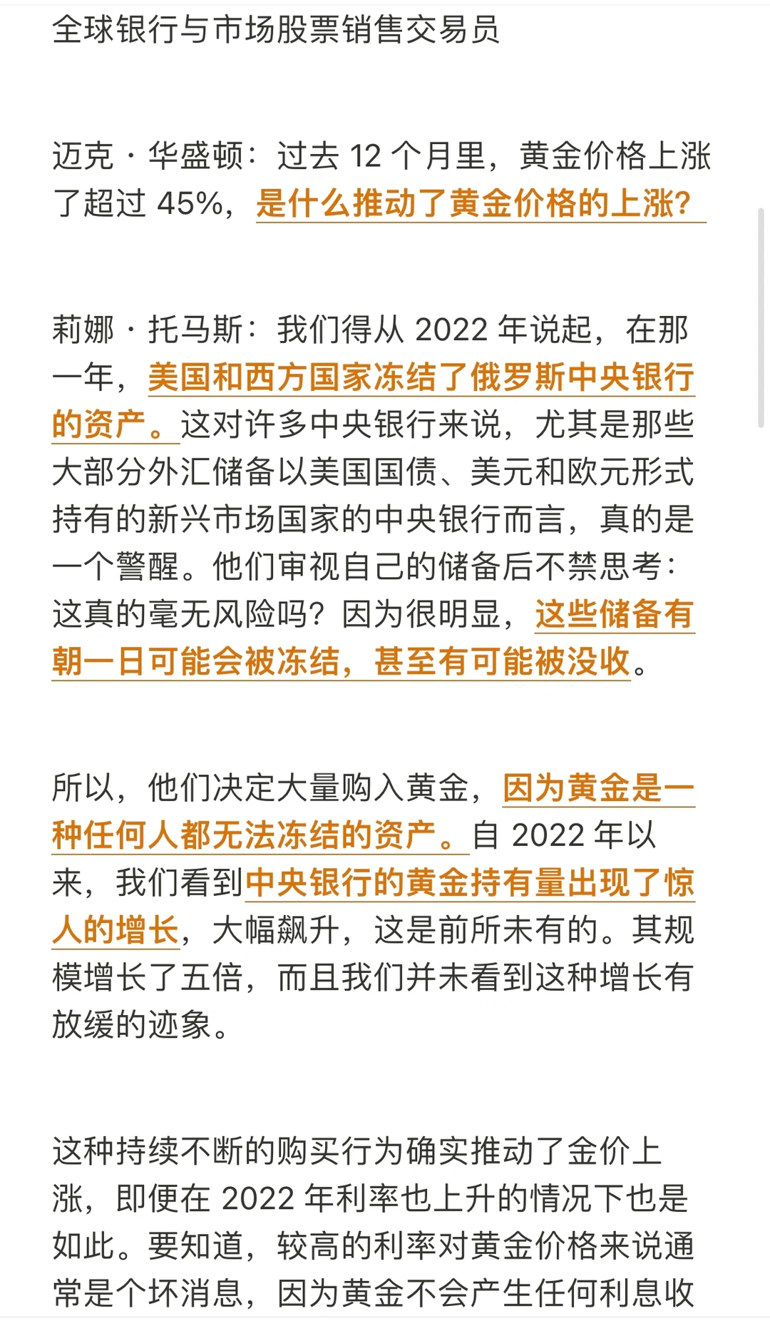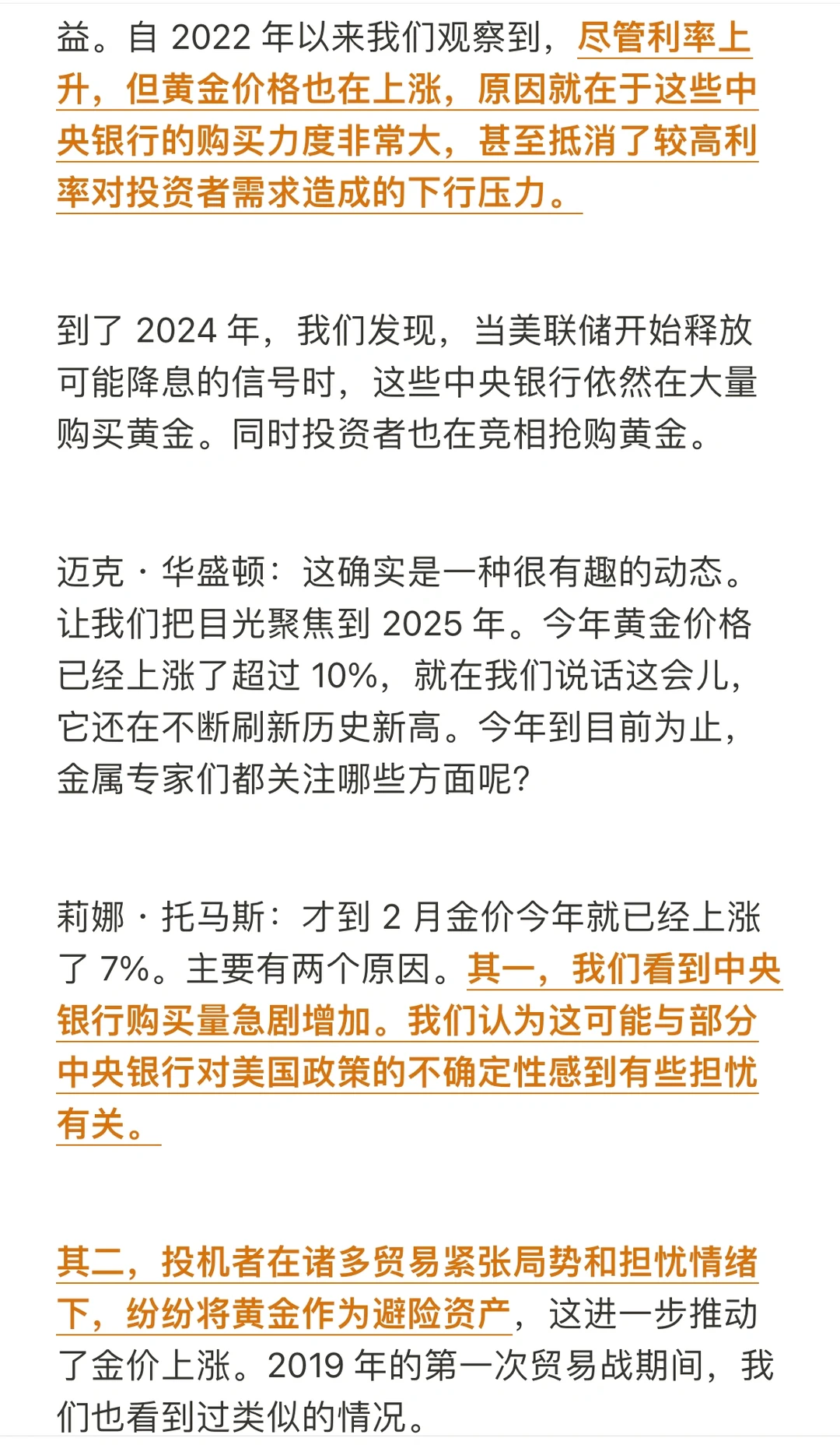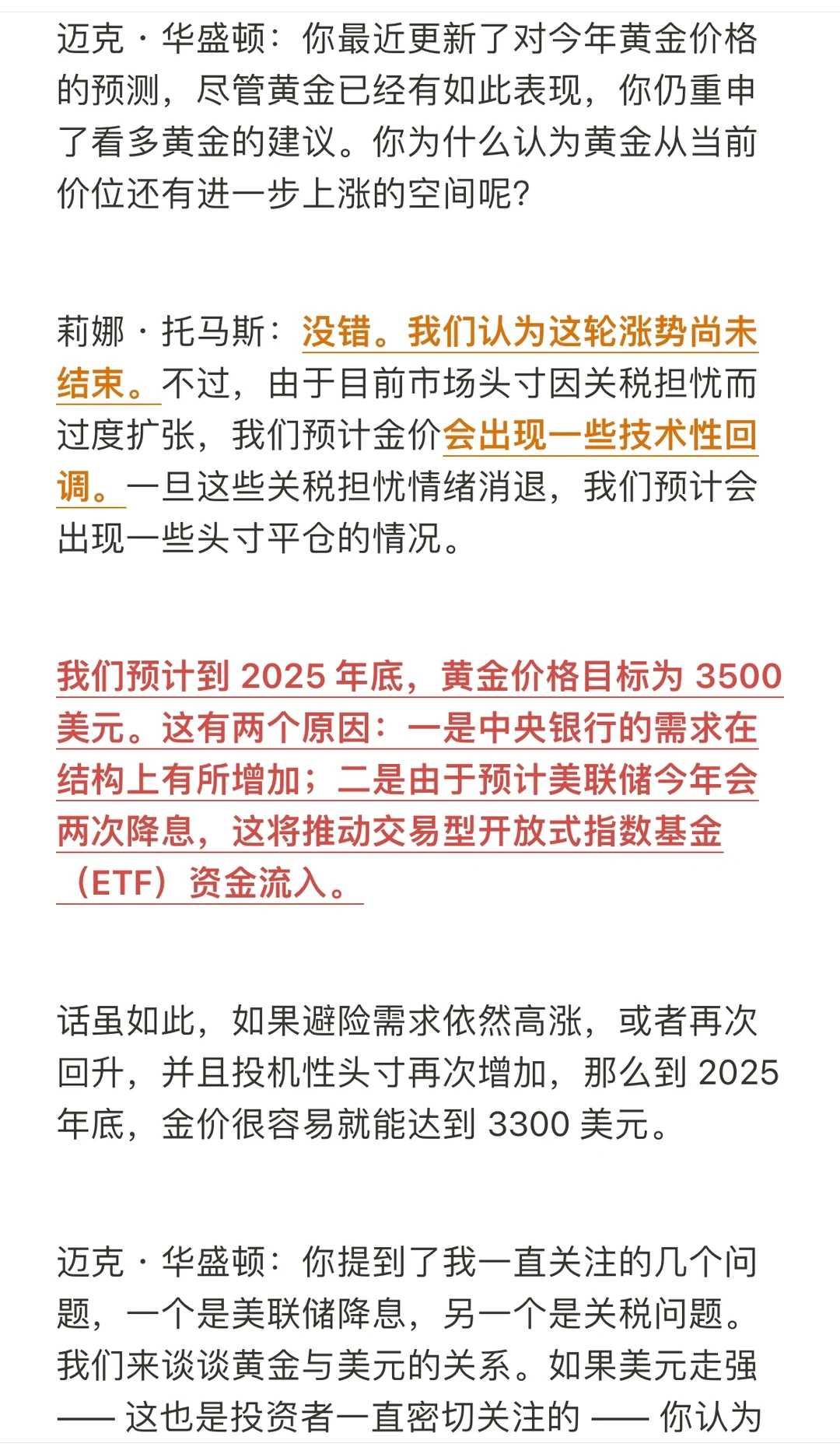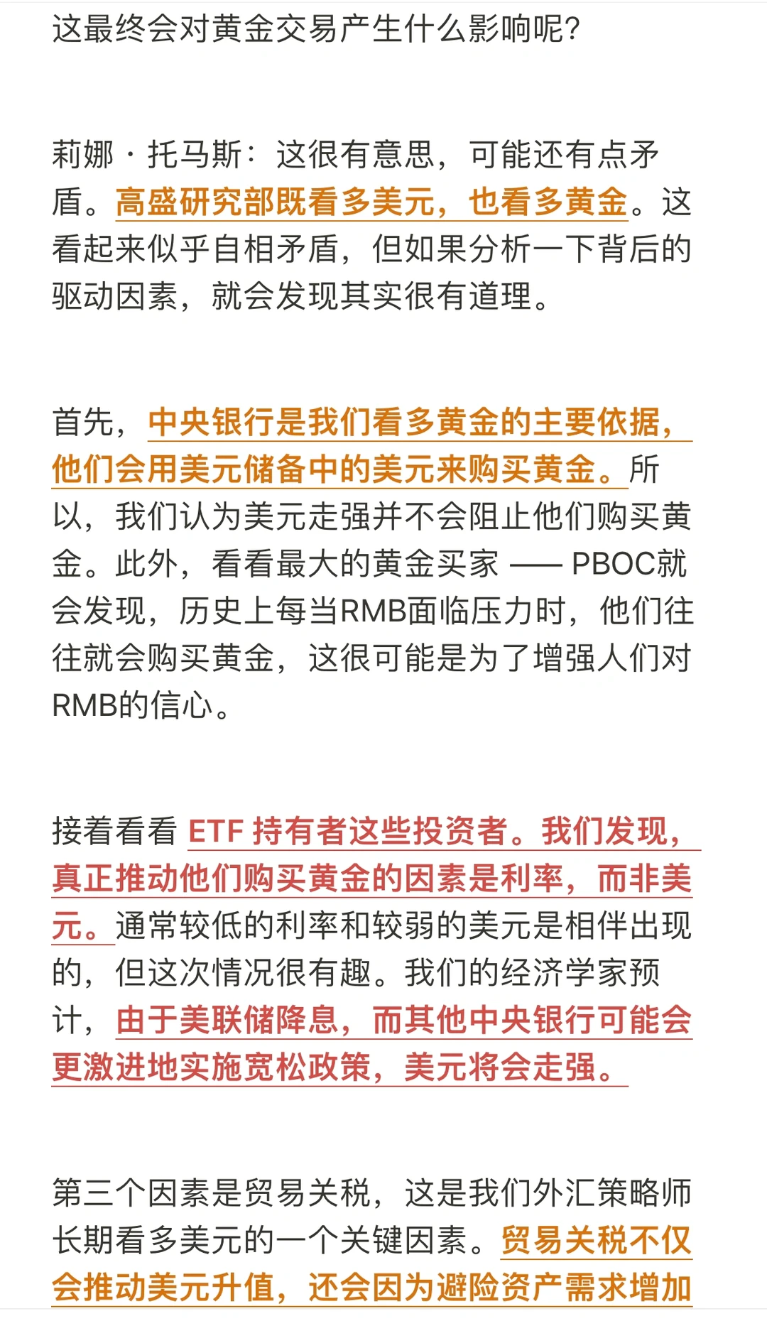 高盛最新一期的The Market,透彻的讲述了对于黄金的判断,在2024年央行购金和投资者避险买入之外,2025年美联储两次降息将使ETF流入黄金,叠加关税避险买入,预计继续推升金价新高。