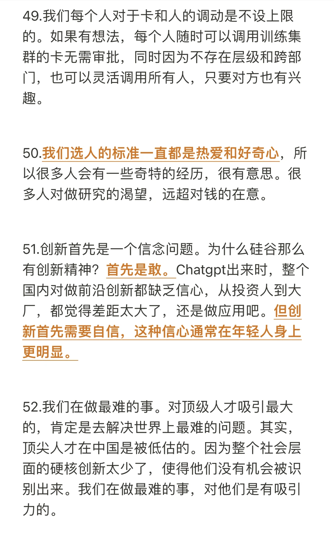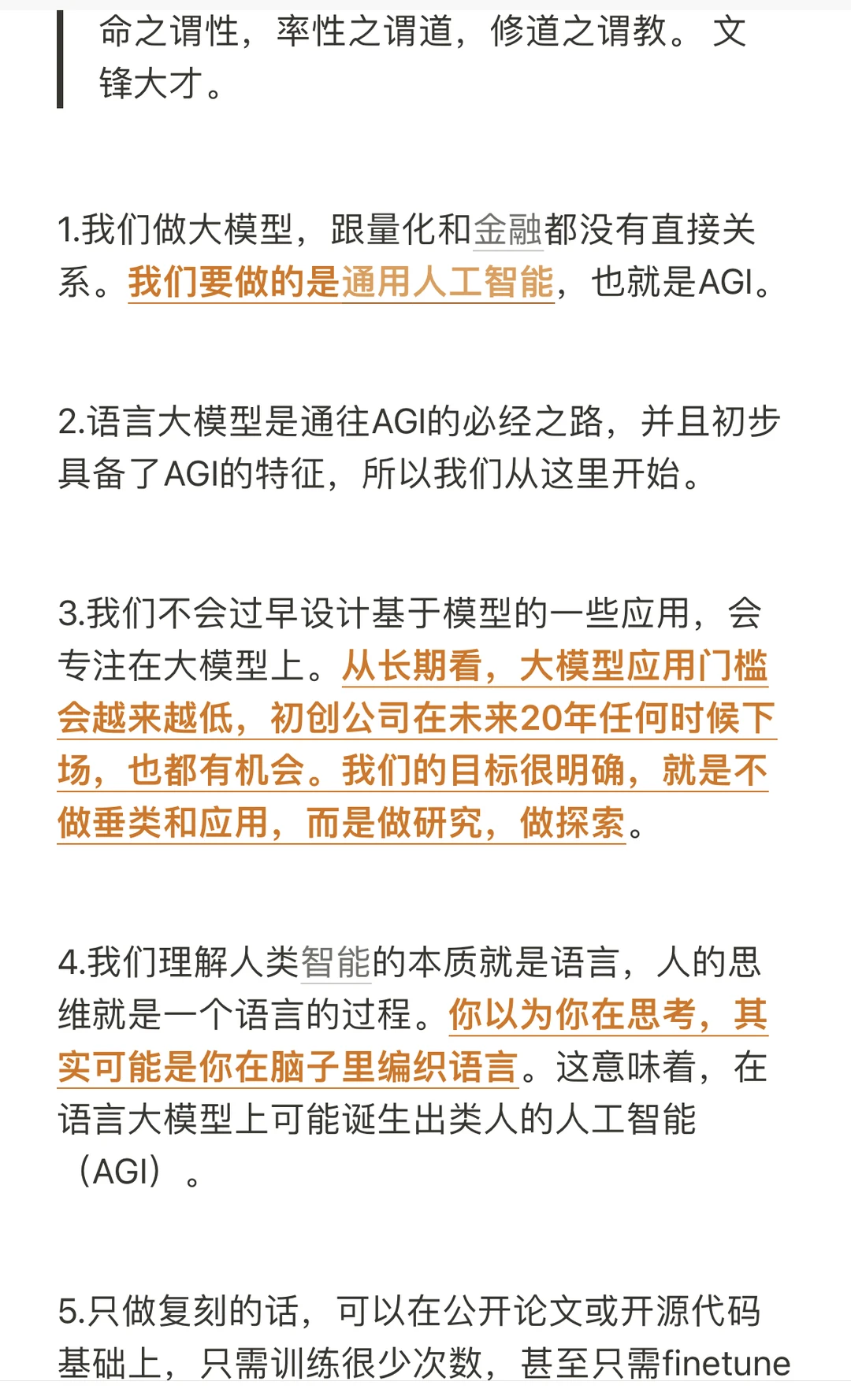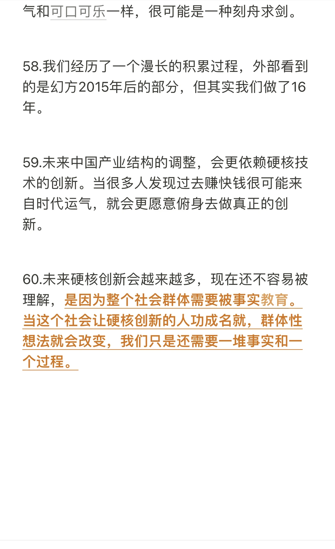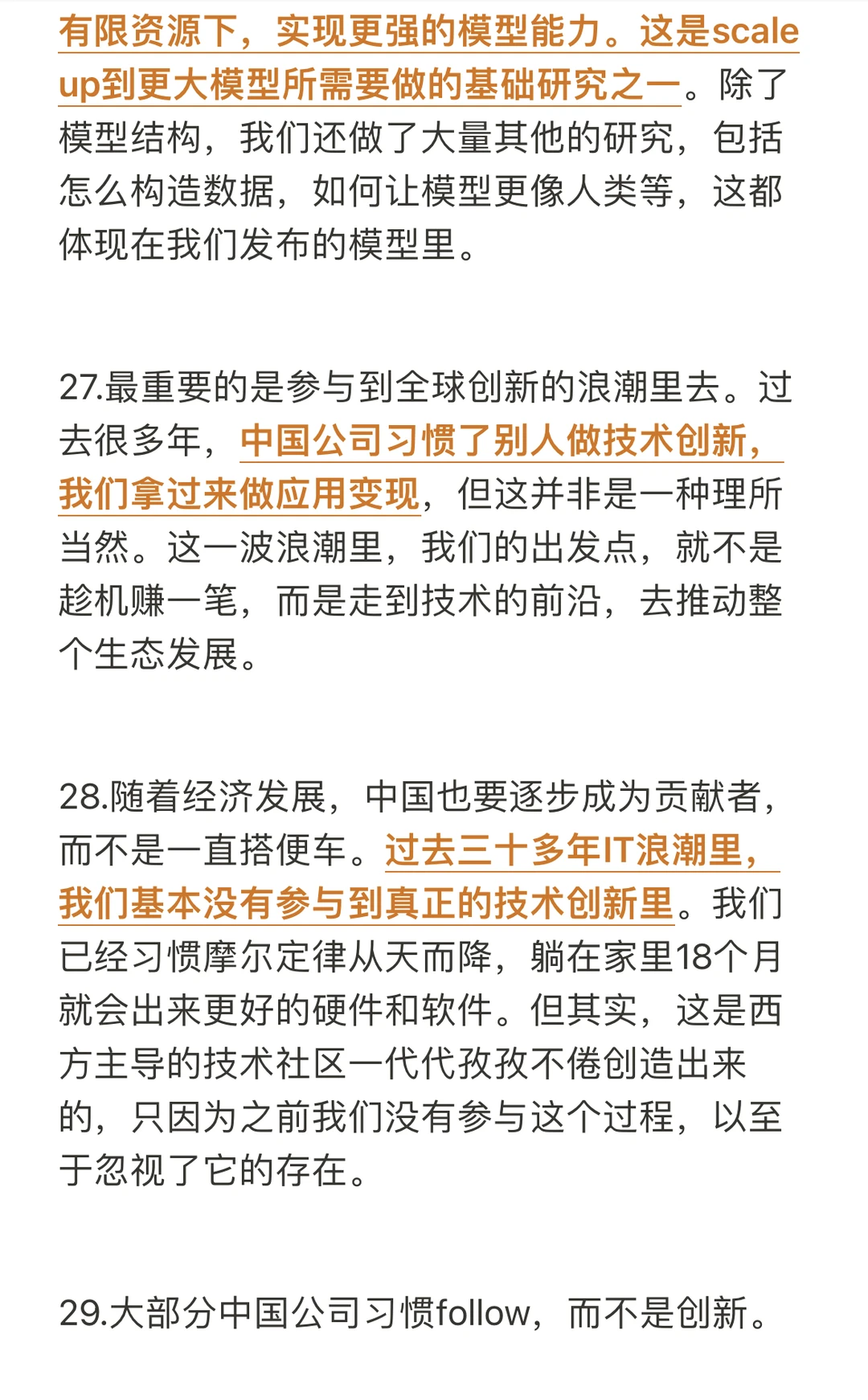 第二次读梁文峰的60条思考,感慨一流的人才永远都在改造物理世界,而这种改造不是盲目的,它建立在对于社会和技术发展阶段的深刻洞察,并在被时代选中的时候勇于站在台前,做难而正确的事情。没有汹涌的理想主义,只有平静务实的思考和做事。 好奇心,探索欲和创造欲,这些特质驱动的个人和组织成长,建立了DS技术创新的护城河。让我想起《中庸》的一句话:天命之谓性,率性之谓道,修道之谓教。 文锋大才。