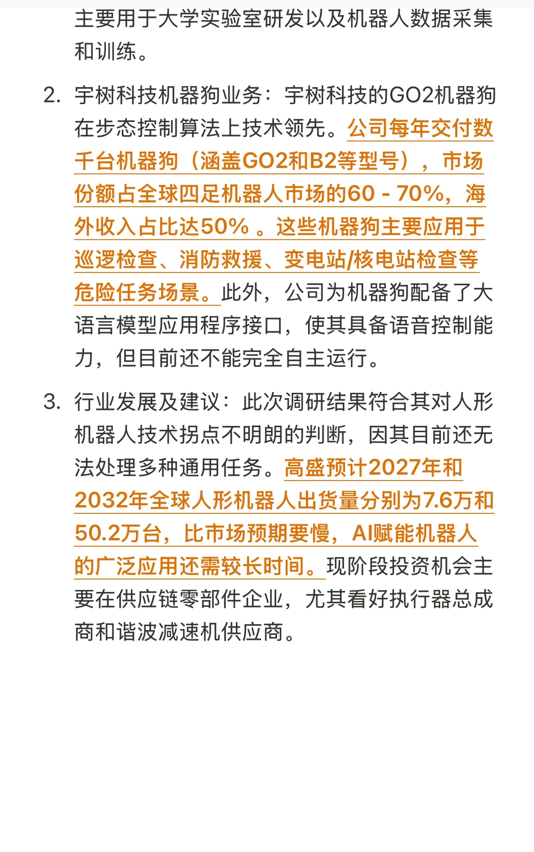 2. 宇树科技机器狗业务:宇树科技的GO2机器狗在步态控制算法上技术领先。公司每年交付数千台机器狗(涵盖GO2和B2等型号),市场份额占全球四足机器人市场的60 - 70%,海外收入占比达50% 。这些机器狗主要应用于巡逻检查、消防救援、变电站/核电站检查等危险任务场景。此外,公司为机器狗配备了大语言模型应用程序接口,使其具备语音控制能力,但目前还不能完全自主运行。