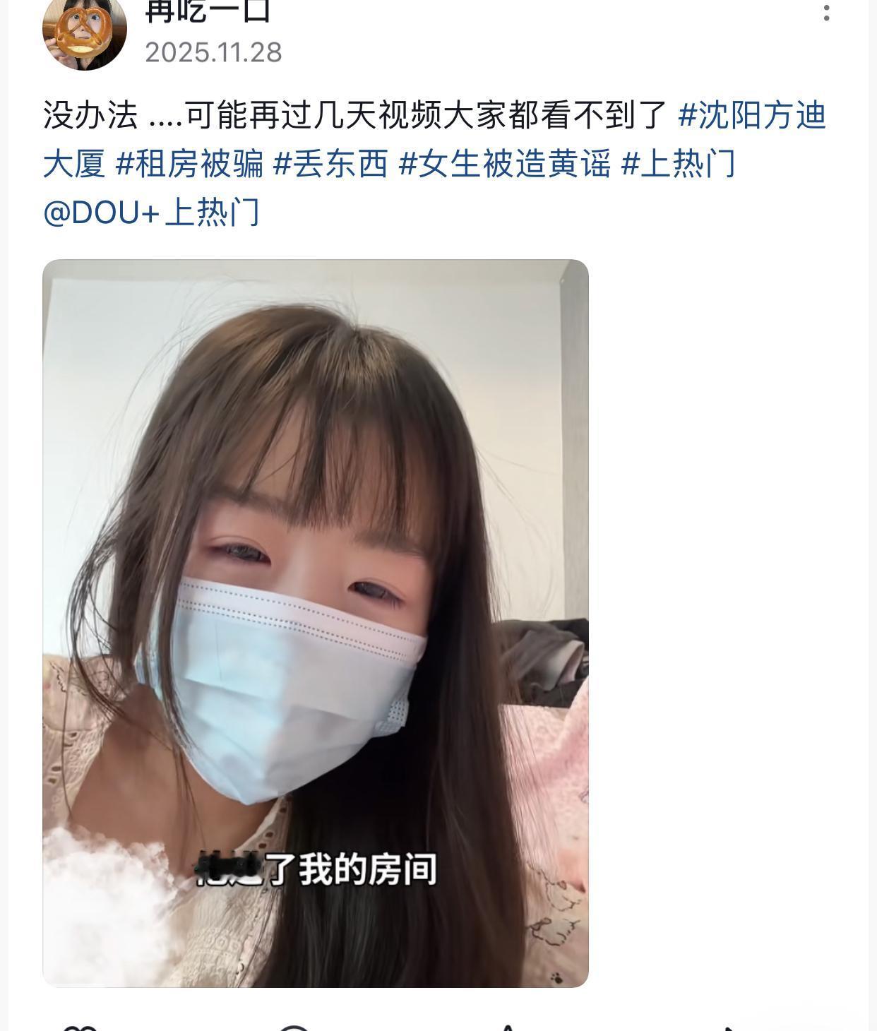明明没有违反租房合同,房东却大晚上的将租客赶了出来,让她只能睡楼道。起因是沈阳女生租了一个顶楼带阁楼的合租卧室,房东本人就住在顶楼的阁楼上面,而女生租的是下面没有门锁的主卧。 女生入住前房东承诺住进去以后安装门锁,可却迟迟没见房东来安装门锁。直到有一次博主出门以后看了一下自己房间的监控,发现有两个陌生男子进入自己的房间。女生之后询问房东,明明入户门有密码锁,而且客厅也有监控,但房东却矢口否认有人进过她的房间。 后来有一天你晚上女生10点多回家,结果刚进门就看到客厅有个中年男子躺在自己卧室门口的沙发上睡觉。女生找到房东要安装门锁或者让她搬到另外一间租金800的有锁房间。房东表示女生可以搬到那间房间,但400的差价不给退(女生当时的那间房间租金是1200),沟通无果。女生因为害怕,于是就是喊来一个认识多年的男性朋友帮忙跟房东协商。但房东表示如果女生再续签了一年就给她换。 因为女生觉得那间房间太不安全了,于是第二天就直接回老家,到了15号,在妈妈的陪同下再次回到沈阳。可是刚住了一个晚上,房东就情绪激动的表示只能博主一个人住,不能有人陪同,后来更是连夜更换门锁,并且不经过女生同意,就将女生的东西全部丢出门外,之后直接拉黑女生, 女生清点自己的物品,发现丢失了800元的现金、身份证以及价值1万以上的物品,因为当时是凌晨一点多,女生只能妈妈在楼道睡了一晚上。第二天女生喊来帽子叔叔,但是房东只是说了一句我现在要去医院,然后就走了。 于是女生就一直等,等到另外一个租客回来进屋的时候,女生准备跟进去,结果里面有一个男的抱着房东刚满月的孩子挡在她的面前,不让她们进去,还喊来帽子叔叔(这次是那个男子喊的)。 等帽子叔叔来了之后,女房东也刚好回来,帽子叔叔说让他陪同女生进去看看女生剩下的东西。结果那名女房东却不配合,后来女房东和那个抱着孩子的男子更是直接提着两个大行李箱准备离开。 帽子叔叔拦住她们说要他们配合调查清楚这件事再走。但是女房东却抱着自己的孩子挡着帽子叔叔面前说了一大堆话,大概的意思就是帽子叔叔没有那个强制性的手段,而且她也不准备配合调查,然后她们开车就走了。 女生多次打电话找她,但是她一直不接电话,直到女生用她的一个男性朋友的电话号码拨过去她才肯接,可一听是让她还东西她就直接挂断,还通过手机号添加这位男性朋友,开始造起了女生黄yao,甚至把女生身份证的正反面发给这位男性朋友。 后来帽子叔叔再给她打电话的时候,她就说人已经不在沈阳本地了,配合不了,甚至还表示等要合同到期以后才回来,而且拒不退还押金跟房租。 之后女生向多个部门举报,但都是以合同纠纷,对方不配合不了了之。女生想要起诉她,但是明明这些所有证据都有,却还是被告知证据不足无法起诉,说只要对方没动手就不算威xie,恐he。