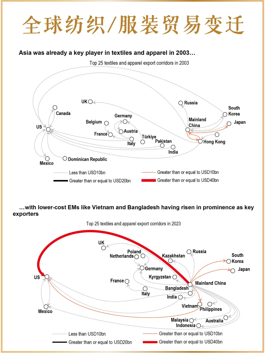 另外,这些年中国还是太全面了。在贸易往来上,2024 年可有超过 180 个市场都把中国列为前五大进口来源地之一,其中 85% 还是新兴经济体。从 2019 年开始,跟俄罗斯、马来西亚、印度和越南等国的双边贸易额蹭蹭地往上涨。2024 年,越南超过韩国和日本,成了中国的第三大出口目的地,从越南出口到美国的商品里,我们的附加值占比一直在稳步上升。