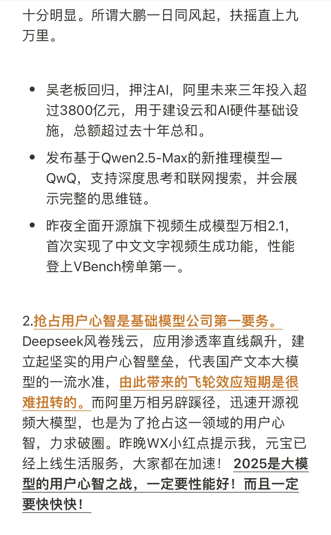2.抢占用户心智是基础模型公司第一要务。Deepseek风卷残云,应用渗透率直线飙升,建立起坚实的用户心智壁垒,代表国产文本大模型的一流水准,由此带来的飞轮效应短期是很难扭转的。而阿里万象另辟蹊径,迅速开源视频大模型,也是为了抢占这一领域的用户心智,力求破圈。昨晚WX小红点提示我,元宝已经上线生活服务。2025是大模型的用户心智之战,一定要性能好!一定要快快快!