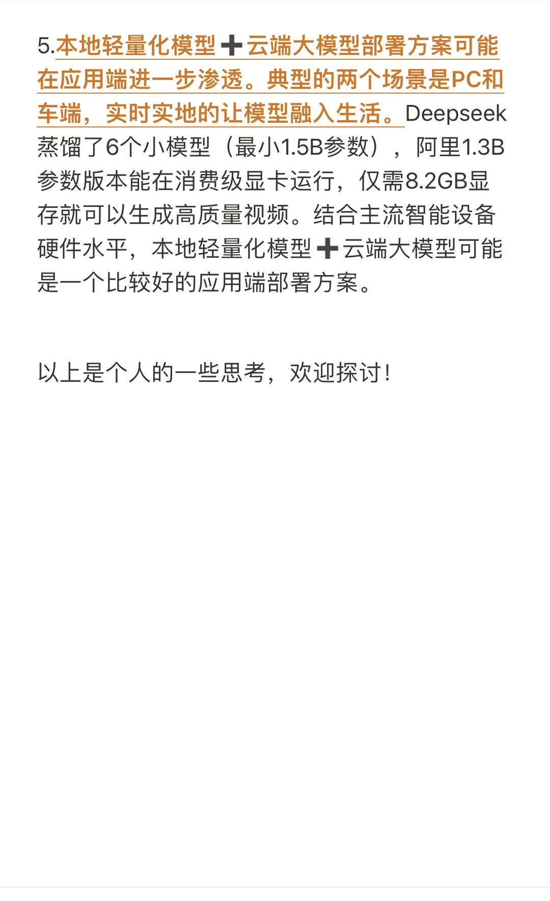 5.本地轻量化模型➕云端大模型部署方案可能在应用端进一步渗透。典型的两个场景是PC和车端,实时实地的让模型融入生活。Deepseek蒸馏了6个小模型(最小1.5B参数),阿里1.3B参数版本能在消费级显卡运行,仅需8.2GB显存就可以生成高质量视频。结合主流智能设备硬件水平,本地轻量化模型➕云端大模型可能是一个比较好的应用端部署方案。