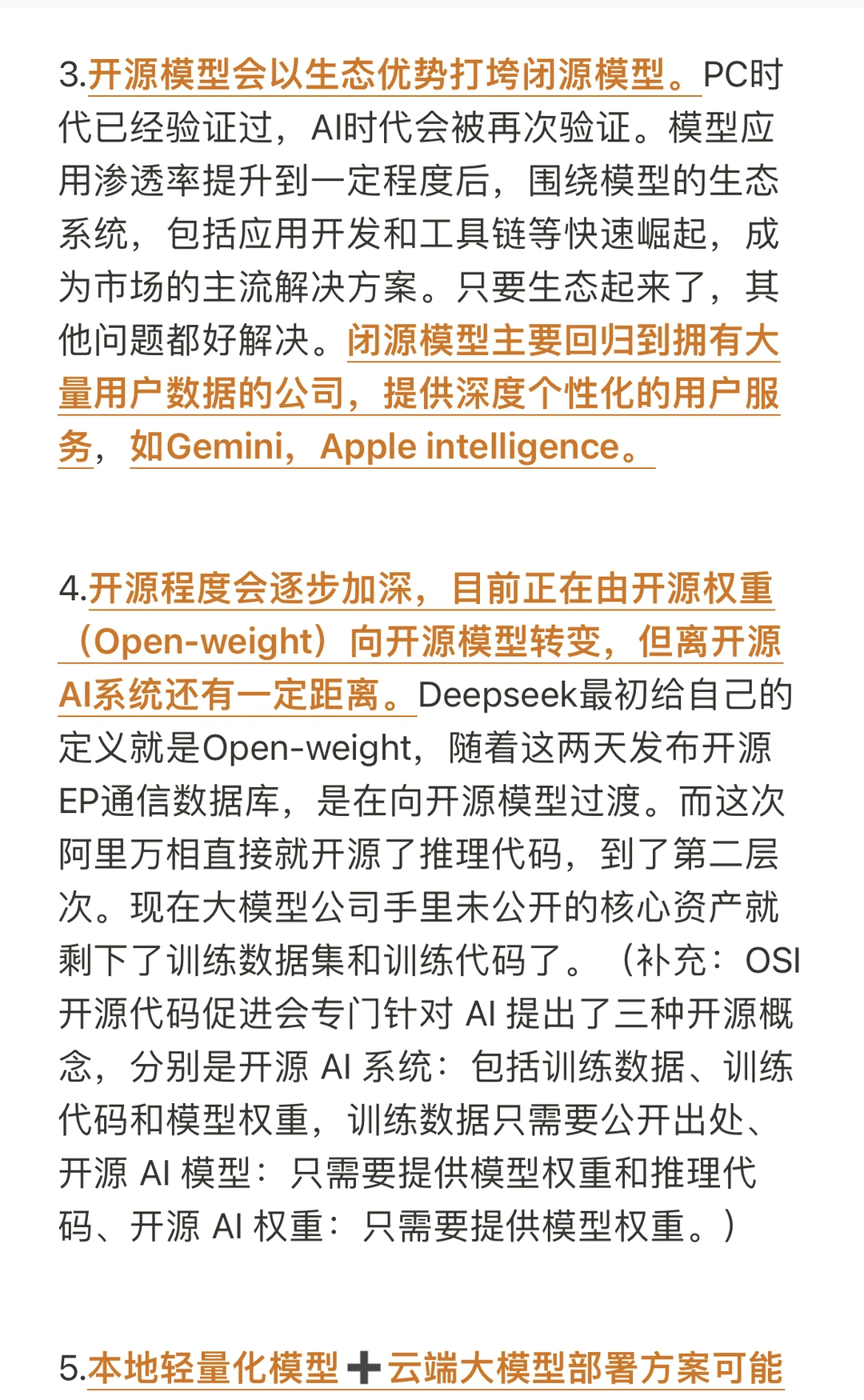 4.开源程度会逐步加深,目前正在由开源权重(Open-weight)向开源模型转变,但离开源AI系统还有一定距离。Deepseek最初给自己的定义就是Open-weight,这两天发布开源EP通信数据库,是在向开源模型过渡。阿里万象开源了推理代码,直接到了第二层次。现在大模型公司手里未公开的核心资产就剩下了训练数据集和训练代码了。(补充:OSI开源代码促进会专门针对 AI 提出了三种开源概念,分别是开源 AI 系统:包括训练数据、训练代码和模型权重,训练数据只需要公开出处、开源 AI 模型:只需要提供模型权重和推理代码、开源 AI 权重:只需要提供模型权重。)