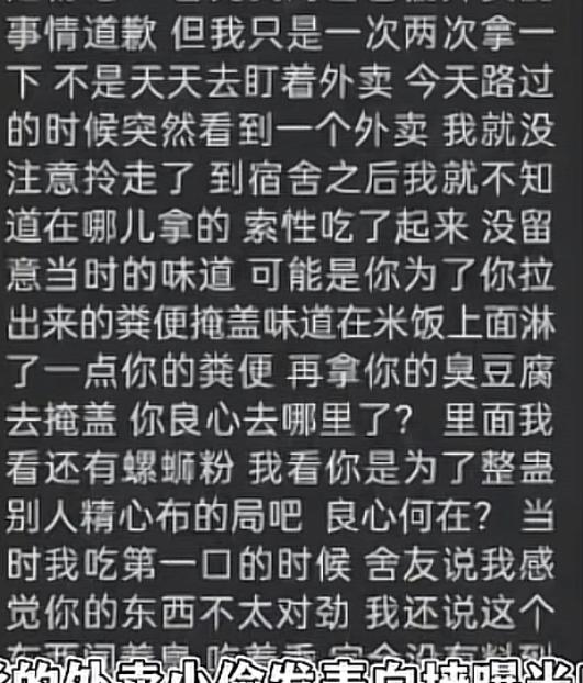 某大学生擅自拿别人外卖吃,结果吃到“奥利给”后,还把这件事发表白墙,真是给我看笑了。 起因是云南某大学,有一名大学生喜欢拿别人外卖吃。某次他路过外卖存放点的时候,随机取走了一份外卖。回到宿舍后他打开一看竟然螺蛳粉配臭豆腐的“双臭组合”外卖,于是他就大快朵颐的享用了起来。 期间舍友闻到了味道,说了一句“你的外卖味道不大对”。他却毫不在意,还嘴硬称螺狮粉和臭豆腐都这样,闻着臭吃着香,直到吃到最后一片臭豆腐,发现碗底竟藏着一坨“奥利给”,这才意识到这份外卖被加料了。 然而他完全没有意识到是自己拿别人的外卖在先,反而认为失主这样做很过分,于是他在校园的表白墙上洋洋洒洒的写了一篇几百字的小作文,责怪失主,还要求失主给他赔偿。表白墙的管理员看完小作文后仅仅只是说了一句你也是有错在先,他就开始把矛头指向管理员。