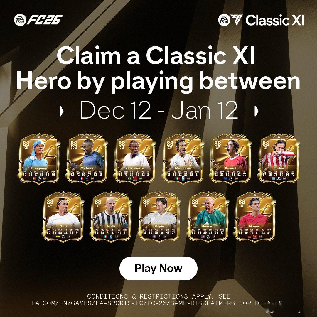 通过“经典 XI 英雄卡包”欢迎一位经典 XI 英雄加入您的《EA SPORTS FC™ 26》梦之队。每位英雄都庆祝了他们巩固传奇地位的时代。要获得您的经典 XI 英雄卡包,您只需在 1 月 12 日上午 9:59 PT(太平洋时间)前,使用您的 EA 账户登录《EA SPORTS FC™ 26》的足球终极球队™模式。符合资格的玩家将能在商店的“我的卡包”部分找到他们的经典 XI 英雄卡包。特别升级:年度最佳阵容荣誉提及英雄为了庆祝这些特殊的经典 XI 英雄物品,在 “年度最佳阵容”(Team of the Year, TOTY)活动开始时,这些新物品还将获得一次性的特别升级,转化为“年度最佳阵容荣誉提及英雄”,以捕捉定义他们职业生涯的英雄时刻。以下是加入 FC 26 的全部经典 XI 英雄:• Blaise Matuidi (布莱斯·马图伊迪)• Claudio Marchisio (克劳迪奥·马尔基西奥)• Guti (古蒂)• Ze Roberto (泽·罗伯托)• Jean-Pierre Papin (让-皮埃尔·帕潘)• Mario Gomez (马里奥·戈麦斯)• Gianluca Vialli (詹卢卡·维亚利)• Diego Forlán (迭戈·弗兰)• Tim Howard (蒂姆·霍华德)• Harry Kewell (哈里·科威尔)• Vincent Kompany (文森特·孔帕尼)FC26