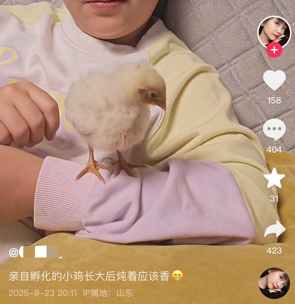 嘴馋的宝妈炖了孩子亲手养大的小鸡,小孩崩溃大哭,宝妈却在一旁边笑边拍视频记录。 山东菏泽一位宝妈居然趁两个孩子上学的时候 把他们亲手养了一百多个日夜的小鸡放进了锅中。孩子放学回家找不到小鸡,只看到一锅浓浓的鸡汤,起初他们还不敢相信妈妈真的会炖了他们养大的小鸡,毕竟他们一起养了一百个日夜。 直到得到妈妈的肯定答案后,他们忍不住大哭了起来。没想到这名宝妈看到孩子哭了,居然还淡定的拿着手机把这一幕记录下来发布到了网上。 回看宝妈之前的视频清一色都是记录两个孩子和小鸡玩的日常,这只小鸡对于两个孩子来说 几乎就是他们人生中第一个养大的孩子,为了将它孵化出来,他们还专门购买了孵化烤箱,亲眼看着它破壳而出,在一点点喂养长大。出去玩的时候都会带着它。 直到看到其中有一条视频,文案写着:亲自孵化的小鸡长大后炖着应该香。才知道原来这一切都是早有预谋。 而她说炖了小鸡的原因是因为小鸡长大了,为了不影响邻居休息,可处理小鸡的方式明明有许多种,可她却选择了这样的一种。把两个孩子最亲手孵化养大付出感情的小鸡当成食物,趁孩子不在家做成美食。 真正爱孩子的家长只会爱屋及乌,而不是随意支配自己孩子的东西,这就是不尊重孩子本身。