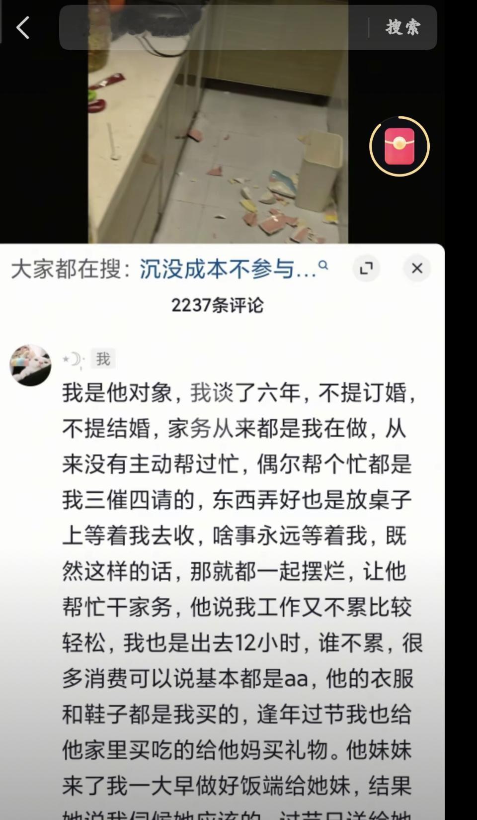 在他问为什么要过这种日子时,或许女友内心也同样在想类似的问题。起因是一男生发视频,说自己下班回来晚了,想泡泡面吃,结果到厨房看到一片狼藉,一时间心态失衡,随后大声的问:为什么人要过这样的生活?为什么要遇到这样的人(女友)。 看到满地的碎碗,他的第一反应不是为什么碗会摔碎了?女友有没有受伤?她是不是也很累?或者发生了什么事情?而是发视频去责怪女友没有做家务。 在他抱怨每天都是这样的生活的时候,有没有想过女友也每天都是这样的生活?女友就偶尔一次没收拾,就心态失衡,我不知道他有什么资格去怪女友。 随后就有一个自称男生对象的人在评论区这样的回复:“我是他对象,我谈了六年,不提订婚,不提结婚,家务从来都是我在做,从来没有主动帮过忙,偶尔帮个忙都是我三催四请的,东西弄好也是放桌子上等着我去收,啥事永远等着我,既然这样的话,那就都一起摆烂,让他帮忙干家务,他说我工作又不累比较轻松,我也是出去12小时,谁不累,很多消费可以说基本都是aa,他的衣服和鞋子都是我买的,逢年过节我也给他家里买吃的,给他妈买礼物。他妹妹来了,我一大早做好饭端给她妹,结果她说我伺候她是应该的。”。 看完这段话后,我觉得女生很好,男生真的配不上女生,趁现在还没结婚赶紧分手的比较好,这哪里是找了个对象,这分明是找了个少爷。
