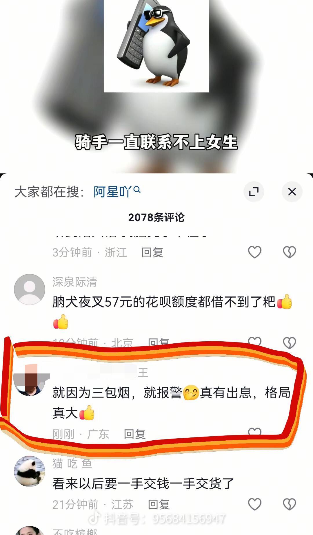 白瓢骑手三包烟,帽子叔叔上门发现竟然不是第一次这么干。 浙江杭州一女生找外卖骑手帮买三包利群,57块钱。收货后跟骑手说线上订单付钱,但没想到女生一直没付钱,骑手多次联系无果后只好联系帽子叔叔。 骑手和帽子叔叔来到女生住处门口,帽子叔叔敲门许久无人回应,骑手也一直拨打女生电话,均无人接听。 此时,隔壁的男房东听到动静走了过来,还没等骑手和帽子叔叔说明情况,男房东就主动询问是不是上次烟钱的事。原来该女生不是第一次这么干了,之前也找骑手帮忙买过三包利群,同样没付钱。 过了一会,帽子叔叔联系上了女生,女生称自己忘记了,马上就付钱。可等了半天,她还是没有把钱转给骑手,之后再打电话也不接了,连房东也联系不上她。 由于一直干等不是办法,再加上帽子叔叔还有其他工作要处理,有位帽子叔叔提出自己补给骑手这笔钱,骑手连忙表示不用,最后是女房东说她先把钱转给了骑手,然后后面她再去找女生要。骑手表示,如果女生后续付钱了,会把钱还给房东。 最好笑的是评论区竟然有人觉得就57块钱,骑手不应该找帽子叔叔,说骑手格局不大。他也不想想这57块钱,骑手要跑多少单才能挣回来,自己站着说话不腰疼,你格局大那就替那女生把钱付给骑手呀。遇到这种情况就算是10块钱也要维权,不然她会继续去白瓢其他人。