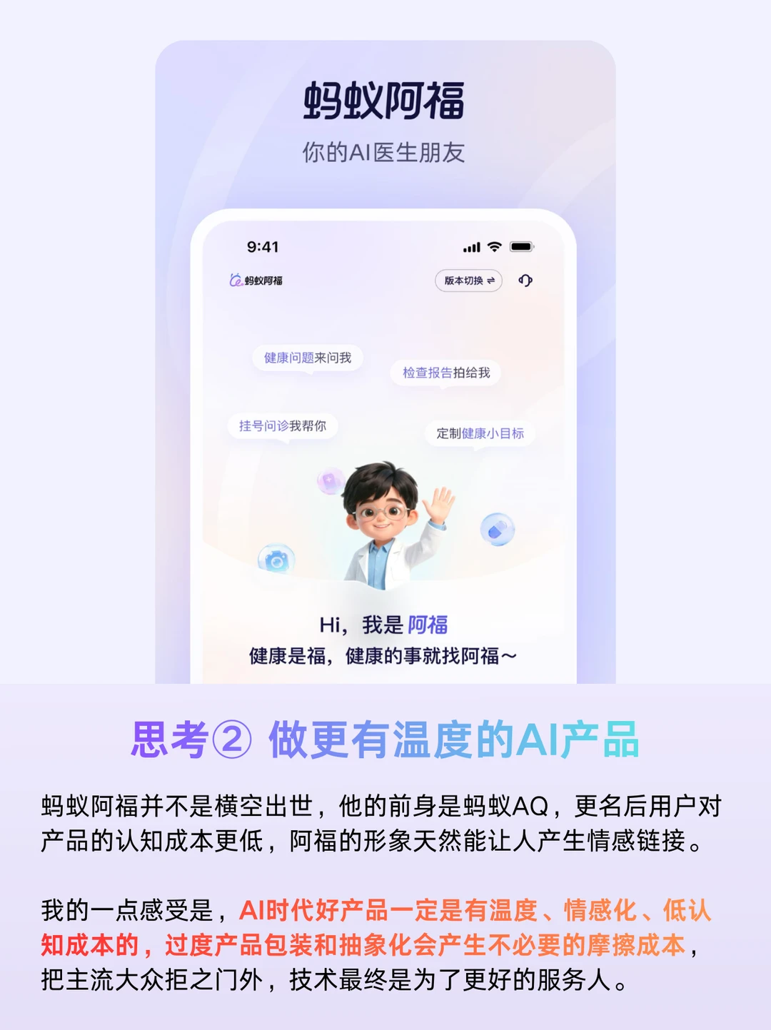 第一,蚂蚁阿福是蚂蚁AQ更名而来,改版后采用了拟人化的形象,用户对产品的认知成本更低,阿福的形象天然能让人产生情感链接。根据公开数据,目前阿福55%的用户都来自三线及以下城市,我的感受是,AI时代好产品一定是有温度、情感化、低认知成本的,过度迎合某一圈层群体和抽象化会把主流大众拒之门外。