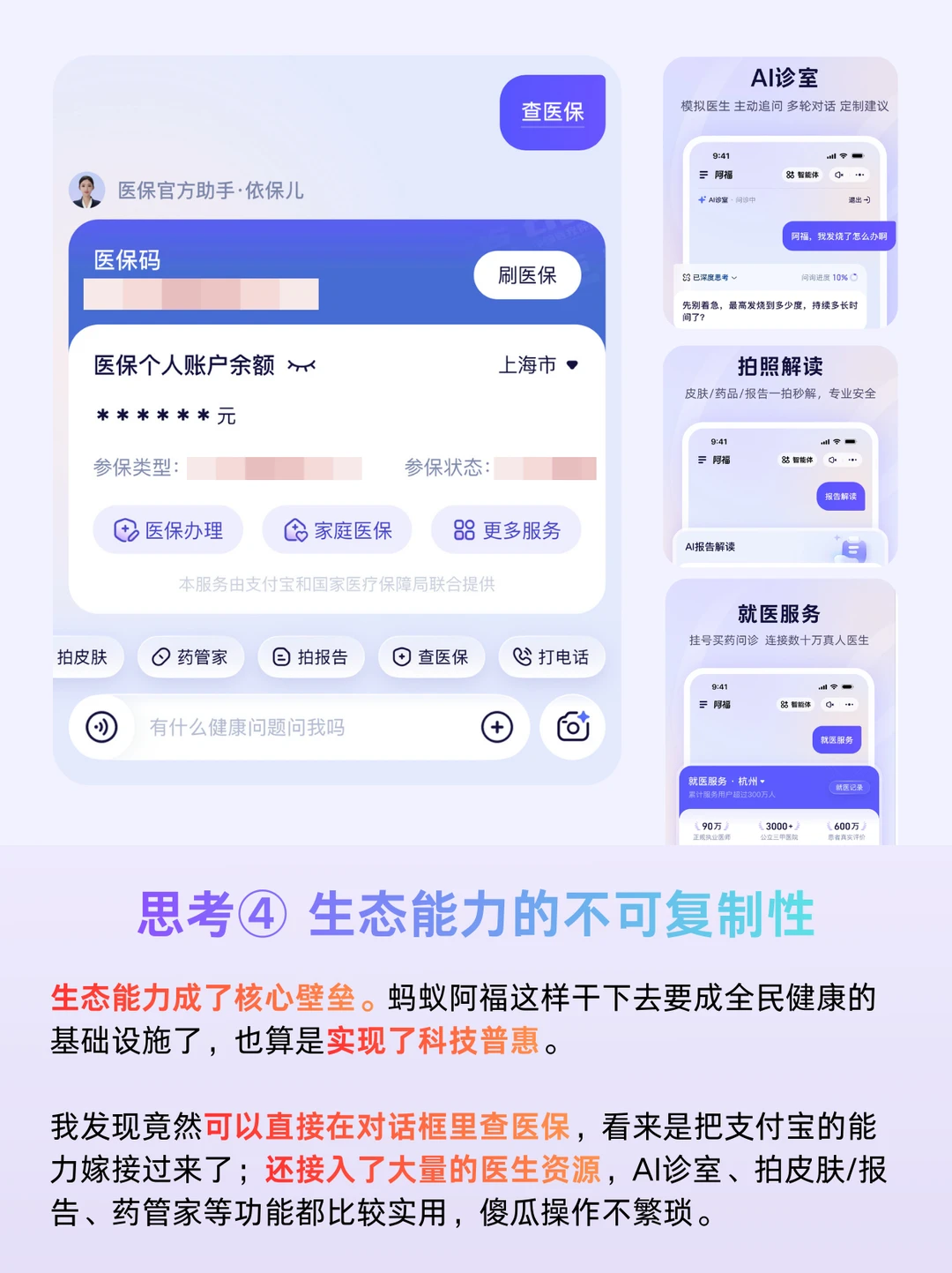 第三,生态能力是最终的护城河。能不能把各类优质资源接入到AI应用里,做成一站式解决方案,这个太重要了,但估计只有大厂有这个能力。阿福有多地卫健委推荐,整合了全国各科优秀的医生资源,使用起来非常方便。如果照这样发展下去,阿福估计会成为全民健康的AI基础设施了。
