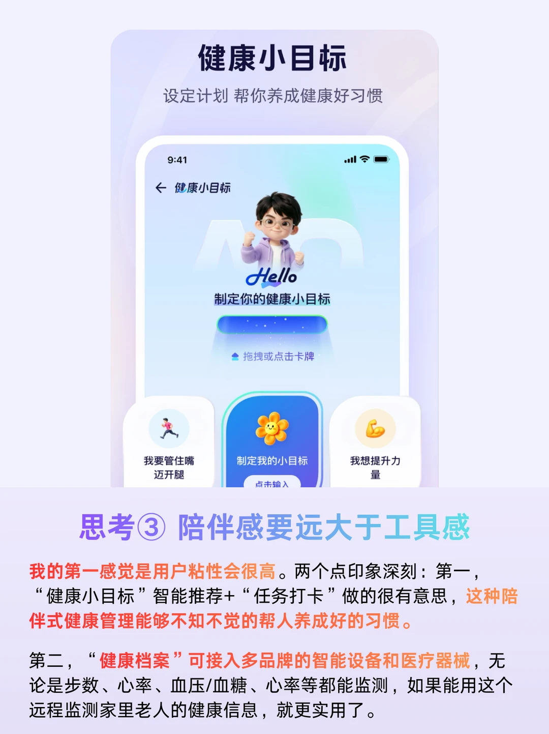 第二,我初步使用阿福的感受是它是一款“陪伴感”很强的健康应用,这样的产品粘性都会很高,反映到数据上就是月活更好。阿福用健康小目标和任务打卡的方式增加互动,同时用“健康档案”功能整合各智能设备和医疗器械的健康数据,一个app整合了健康的各种维度,非常人性化,降低了不同设备间切换的摩擦成本。
