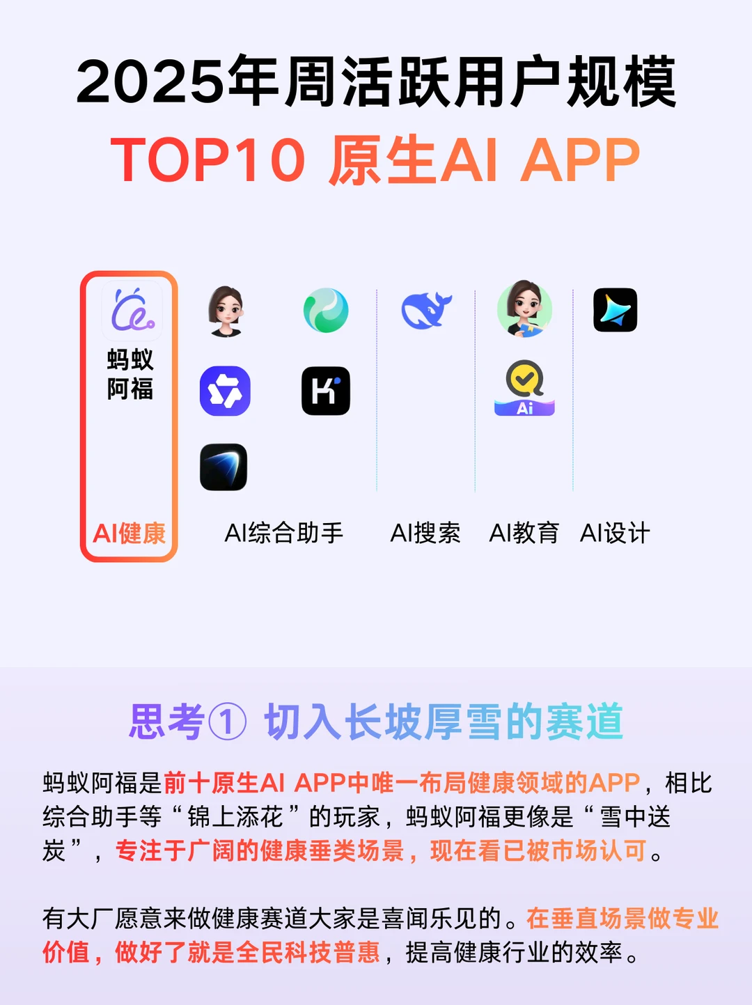 QuestMobile发布了2025下半年AI应用落地报告,最火的4个AI APP:豆包、DeepSeek、元宝、蚂蚁阿福(按周活跃用户排名1208-1214),仔细一看前3个都是AI综合助手/搜索相关,看来大家还是主要用AI做一些通用化的任务,而真正结合垂类场景的只有蚂蚁阿福一个。